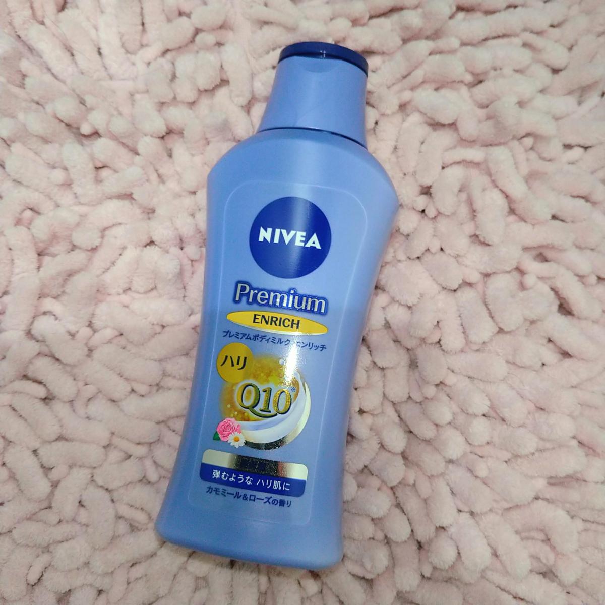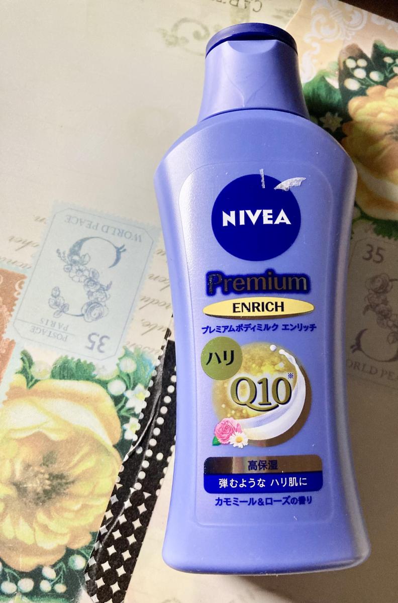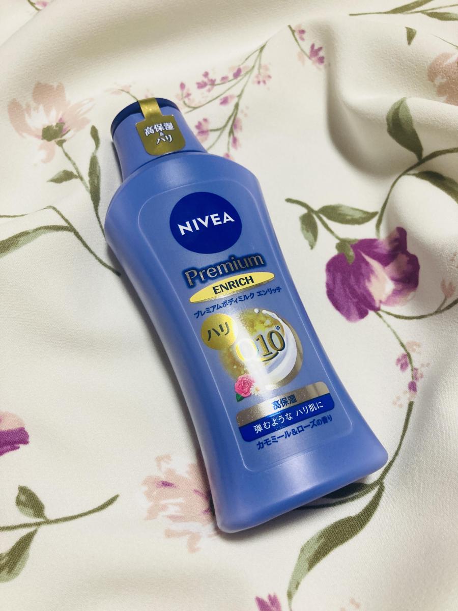 ニベア プレミアムボディミルク エンリッチのパッケージに目が惹きどんな使い心地か気になり購入してみました。フタ開けるとカモミール&ローズの香りがすっごく心地良くて、ボディに伸ばすとふわっと香るのが気に入りました。テクスチャーは伸びが良く、肌にすっと馴染み、塗り心地はベタつかず、さらっとしており、しっとりとした使い心地で大変使いやすかったです。