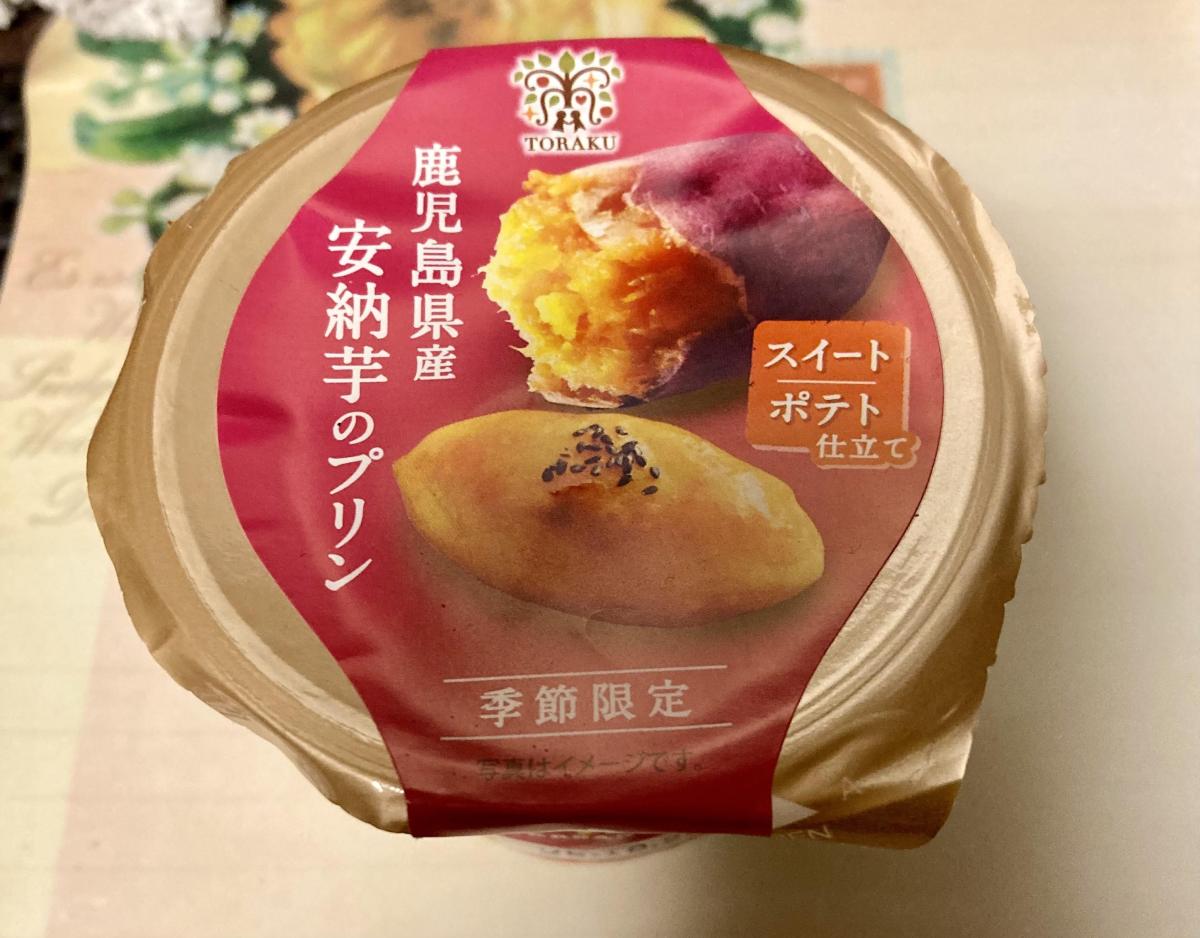 さつまいもの皮をイメージする赤紫色のラベルに、焼きいもとスイートポテトのイメージ写真がとてもおいしそうです。鹿児島県安納芋を使っているというプリンです。