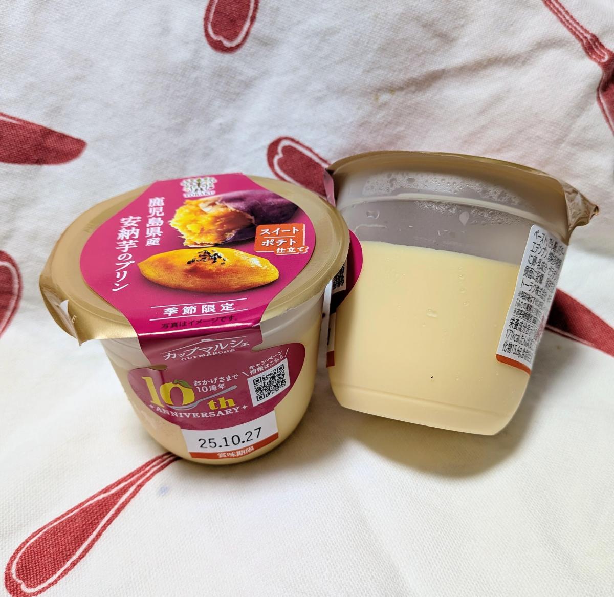 鹿児島県産安納芋を使ったスイートポテト味のプリンです。他のカップマルシェの季節限定を、栗とかぼちゃも一緒に食べ比べましたが、この安納芋が一番好みでした。