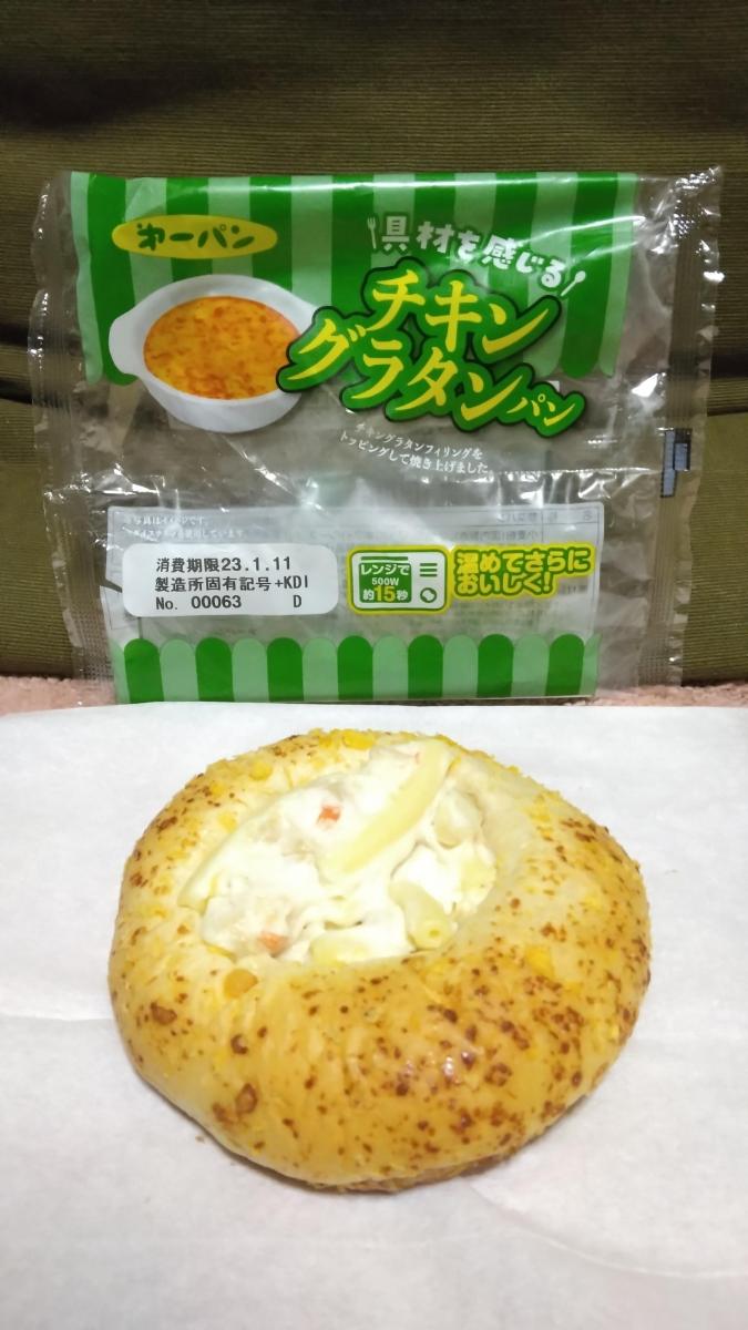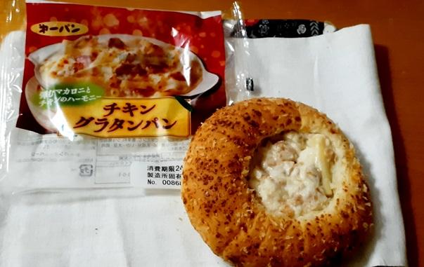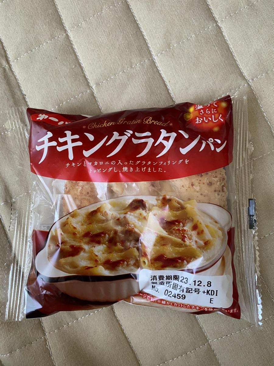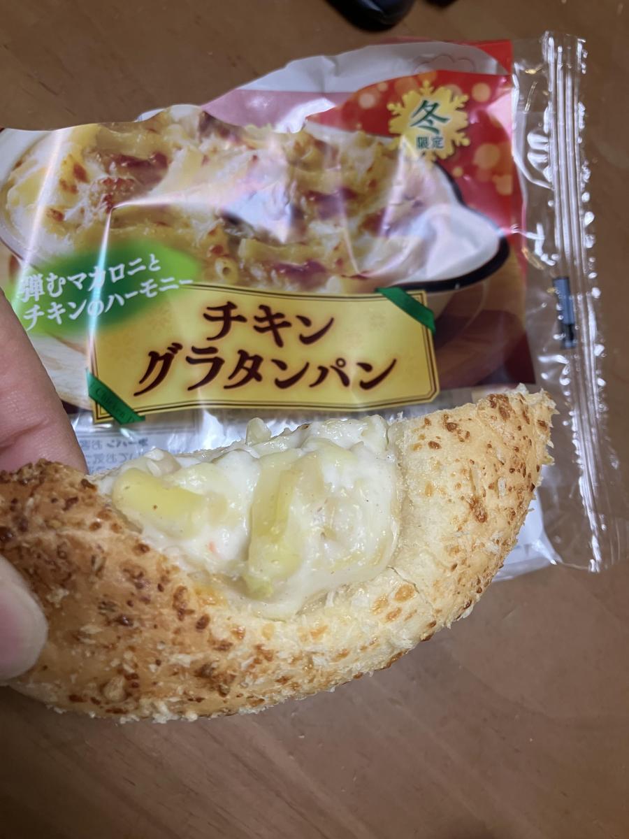 パン生地は軽くてふわふわなタイプ。小さめですが多少は重さを感じるように具のグラタンはまあまあ入っていました。コクはあるが塩分はほどほどと言った感じでグラタンの味は良い。マカロニとチキンが入っていて玉ねぎの食感が良いアクセントになっている。温められる場所で食べられなかったのですが温めたら美味しいだろうなと思いました。