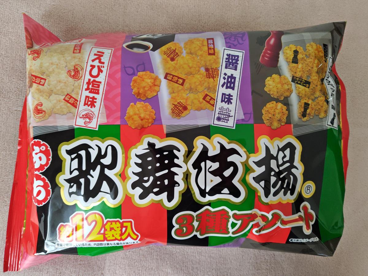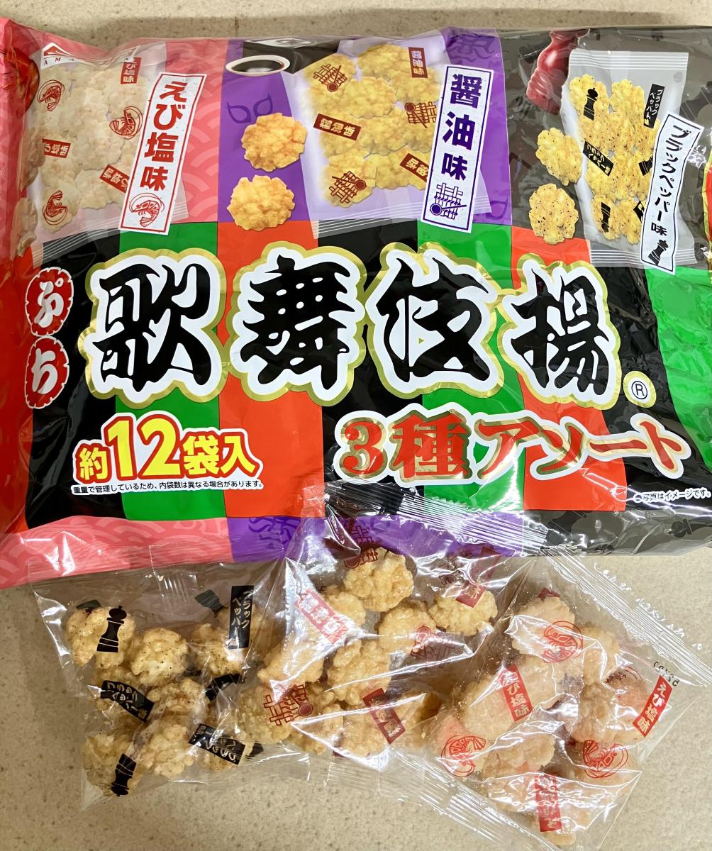 醤油、えび塩、ブラックペッパー味の3種が入ったアソートパック。醤油とえび塩はおやつに、ブラックペッパーはお酒のつまみにピッタリでした。どれも美味しいのですが、ひと粒が小さすぎて歌舞伎揚って感じがしないような?大勢で食べる時にはイイと思います。個人的にはやっぱり大きいサイズの歌舞伎揚がイチバン好きです。