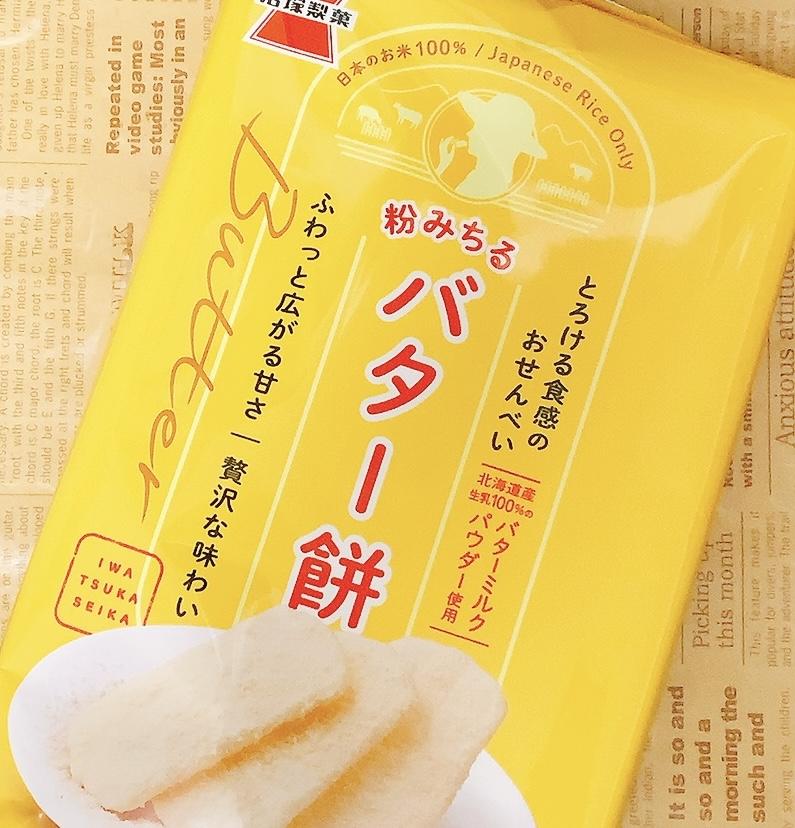 かなり珍しいお煎餅、バター餅です。薄くて軽いお煎餅にバターの細かい甘いパウダーのようなものがまぶしてあり、とても癖になるおいしさです。1枚16カロリーしかないので、ダイエット中もかなりオススメのお菓子です。