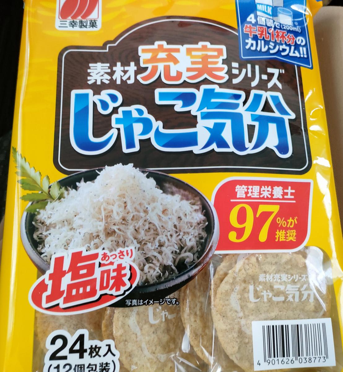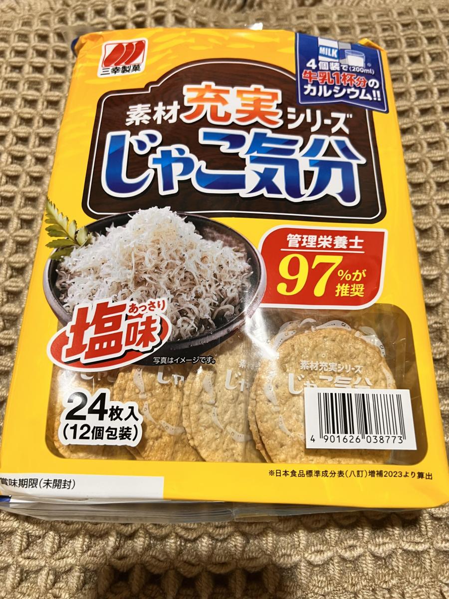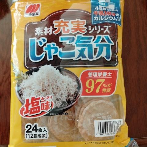 優しい塩気とじゃこの薄い味が美味しくパリッとしたせんべいです。一袋に、2枚入っているのでコスパが良いのとカルシウムも一緒に取れて嬉しいです