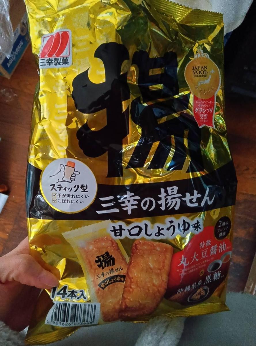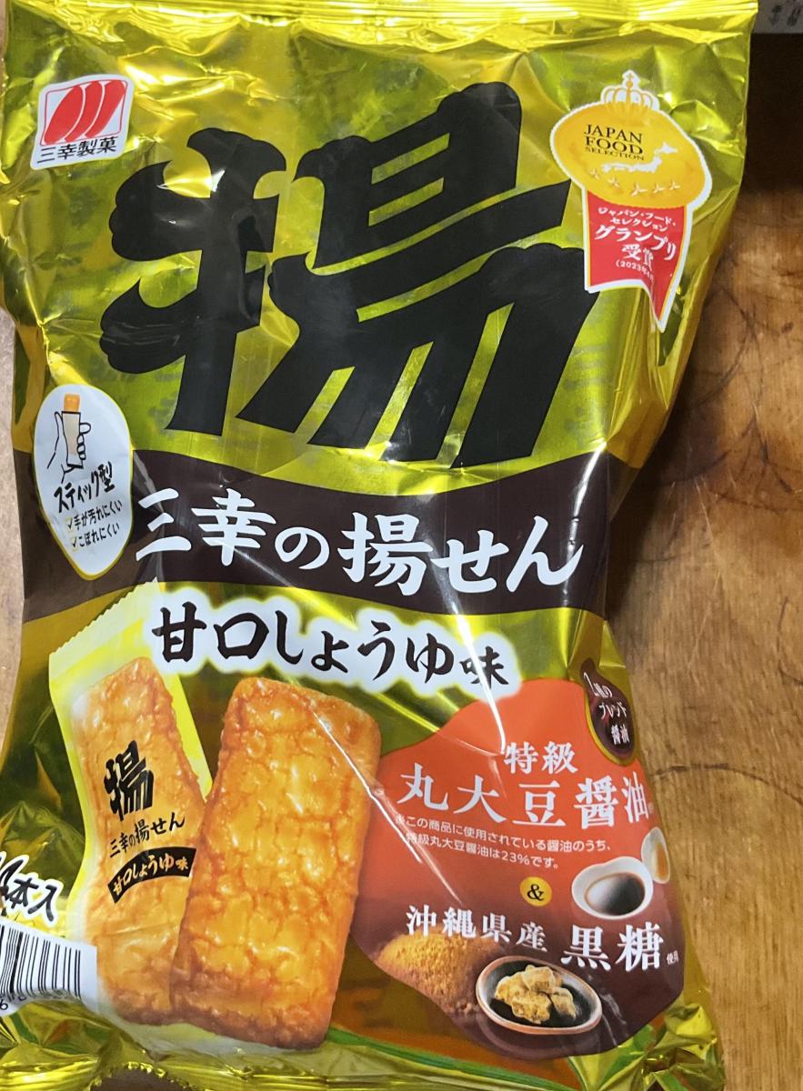 三幸製菓のパリパリ美味しいおせんべい。甘口しょうゆ味とあり、確かに甘香ばしい味わいなのだけど、最後に七味系のピリッとした辛さも感じるので、大人美味しいおせんべいな感じ。子供たちはパクパク食べて、後味が辛いから牛乳を飲みたいと言います。今までにない味わいでクセになり何度もリピートしています。