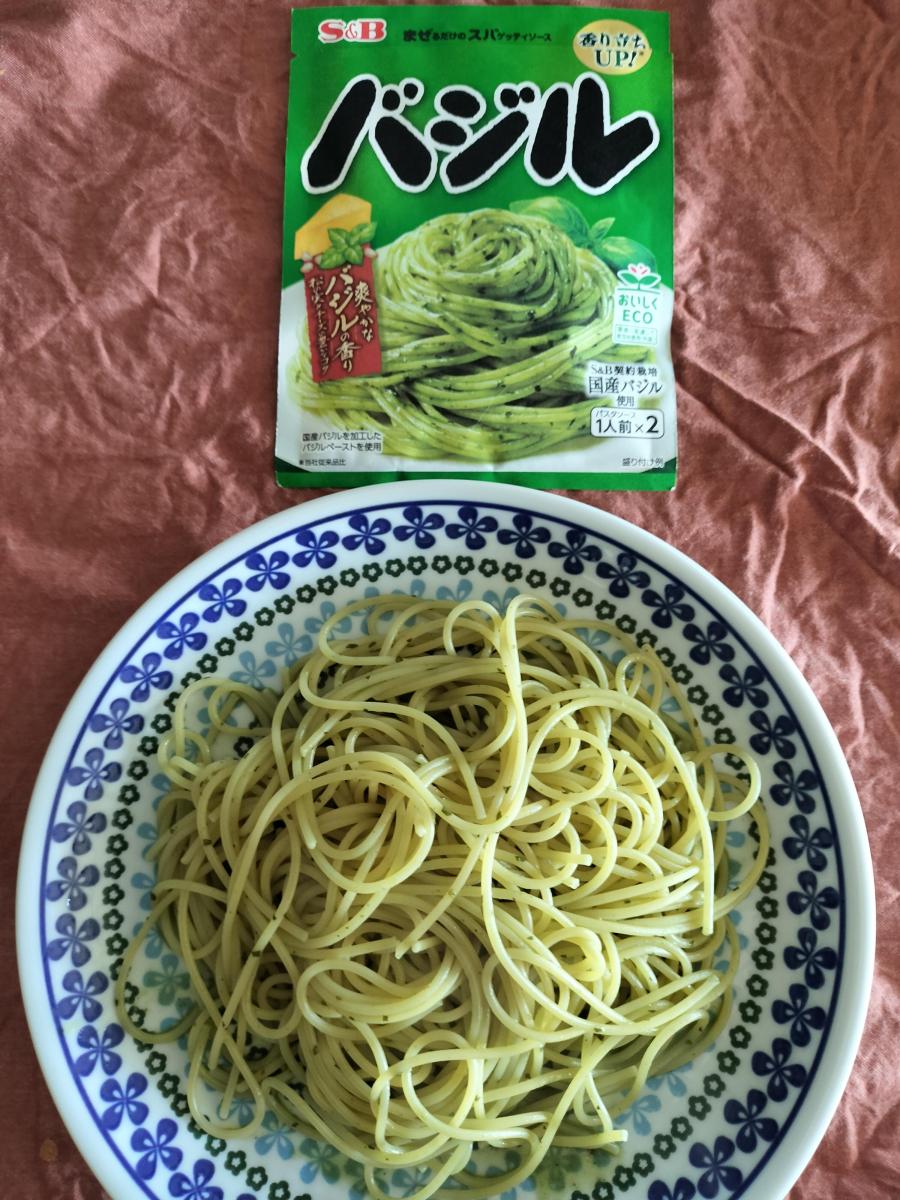 茹でたスパゲティにまぜるだけ。あっと言う間においしいスパゲティができちゃうエスビーのまぜスパシリーズ。かなり深い緑のソース。温かなスパゲティに絡めると淡いグリーンに早変わり。他のフレーバーには当たり前のようについているトッピング小袋がバジルにはありません。トッピング小袋がないのはちょっと寂しいな。粉チーズや松の実、ドライバジルとか何かおまけがほしいよね。