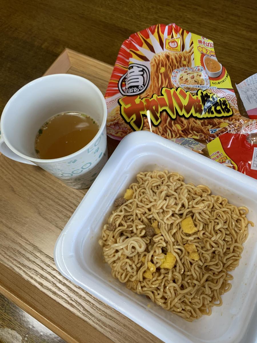 香りは普通に醤油味のラーメンのようで、味も醤油味の汁なしラーメンのようでした。ソース焼きそばよりあっさりしてるから食べやすかったです。味からチャーハンはあまり思い出しませんでしたが、具材は卵とお肉だったのでこの点に少しチャーハン感がありました。麺は太すぎず細すぎず弾力がちょうど良く美味しかったです。