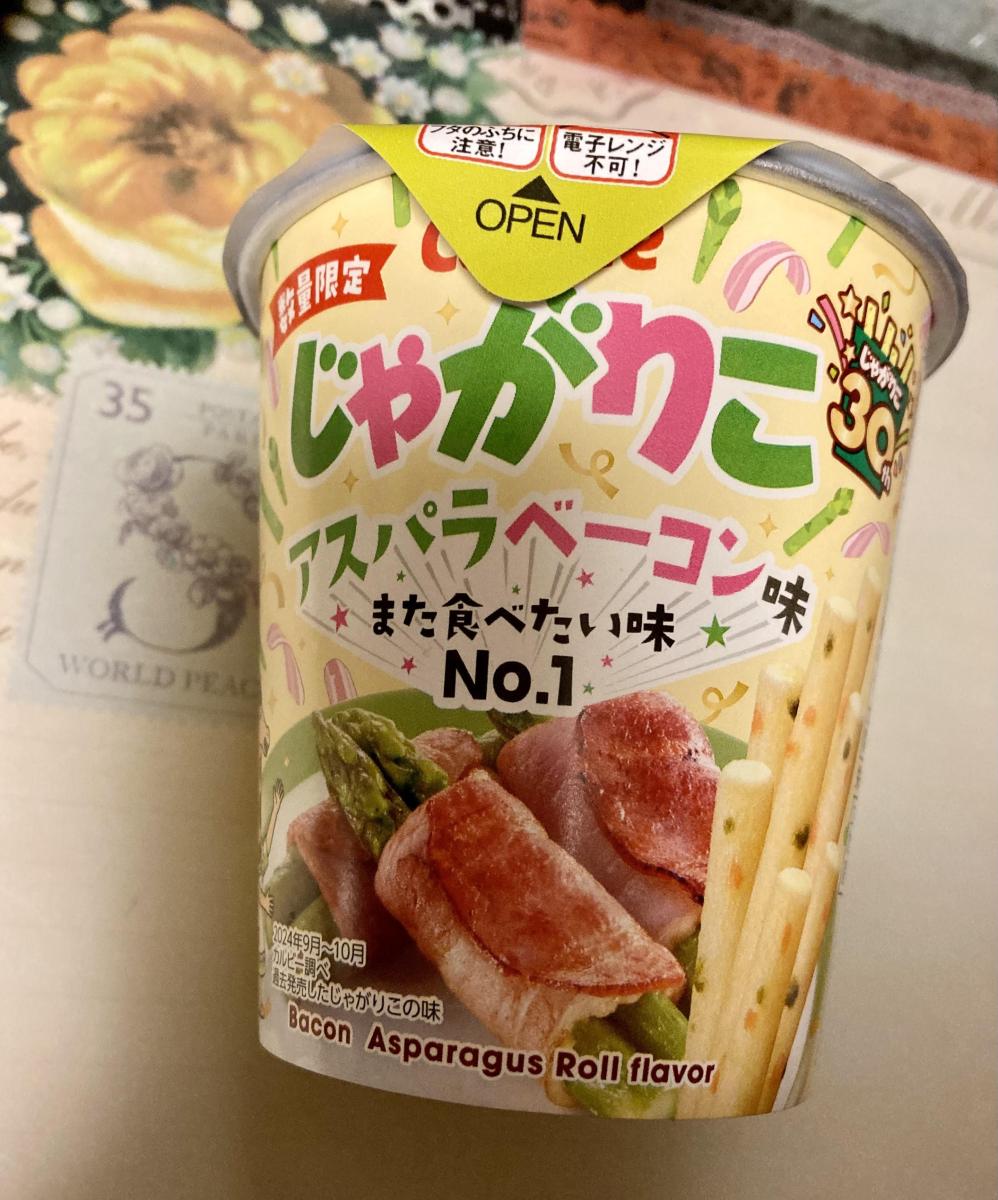 じゃがりこ アスパラベーコン味のネーミングとパッケージのかわいさに目が惹きどんな味か試したく購入してみました。封を開けるとアスパラの香りがたっぷりと感じ食欲がそそります。じゃがりこのカリカリサクサク食感はいつも通りで大変やみつきになります。食べるとアスパラのベーコン巻そのものでした。こんなにアスパラの味がちゃんとするって凄いなと思いました。味は濃いめなのでおつまみにもぴったりな味わいだなと思います。