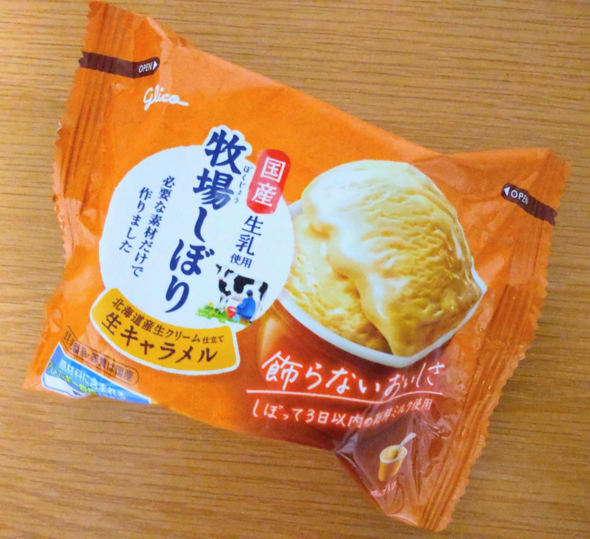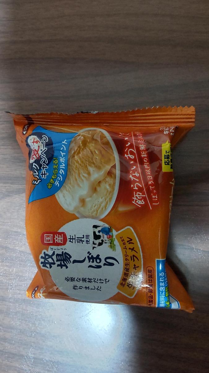 濃厚なキャラメル味一色なのかと思っているとそうではなく、元々のミルク味も感じられる、まろやかな生キャラメル風味のバニラアイスでした。普段はラクトアイスやアイスミルクを買うことが多いのでそのあっさりした味わいに慣れていた為か、牧場しぼり(アイスクリーム)を口に入れた瞬間から、いつもと違うコクの際立った独特のミルキーさを殊に感じれました。