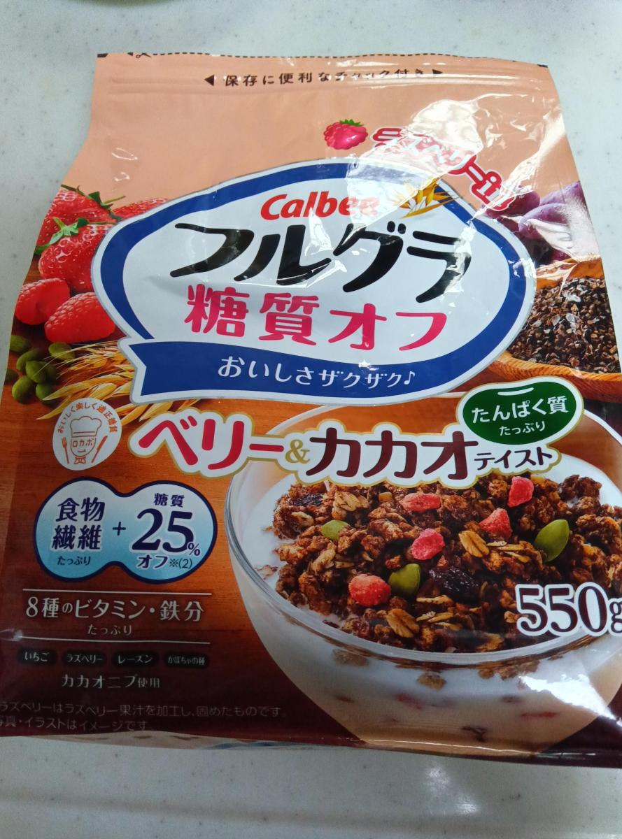 毎朝食べてるフルグラ、今回初めて気になってたベリー&カカオを購入しました。袋を開けるとカカオの良い香りが漂い食欲をそそります。子供の卒園式の門出の日に普段と違うちょっとスペシャルな朝ゴパンにしようとメロンパン風に食パンにフルグラをたっぷり乗せて食べました。一目見て大喜びのこどもたち。カカオがほろ苦さとドライフルーツの甘酸っぱさがちょうどよく子供たちも美味しいとペロリと食べました。カリカリ食感がとても良く甘さもあるのに糖質オフなのもとても嬉しいです!子供たちからも明日も食べたいとリクエストされ家族みんなにリピート希望のフルグラです。