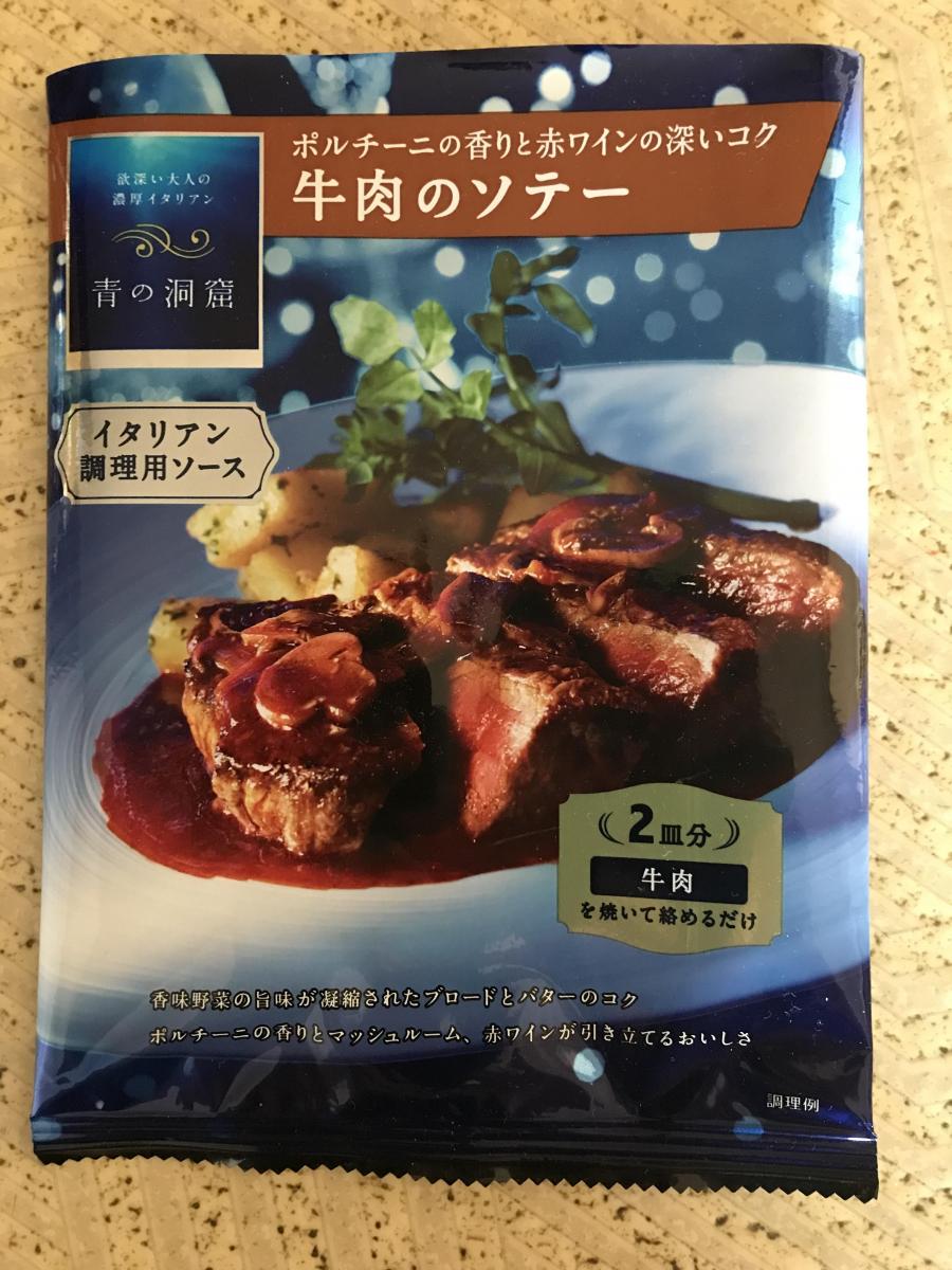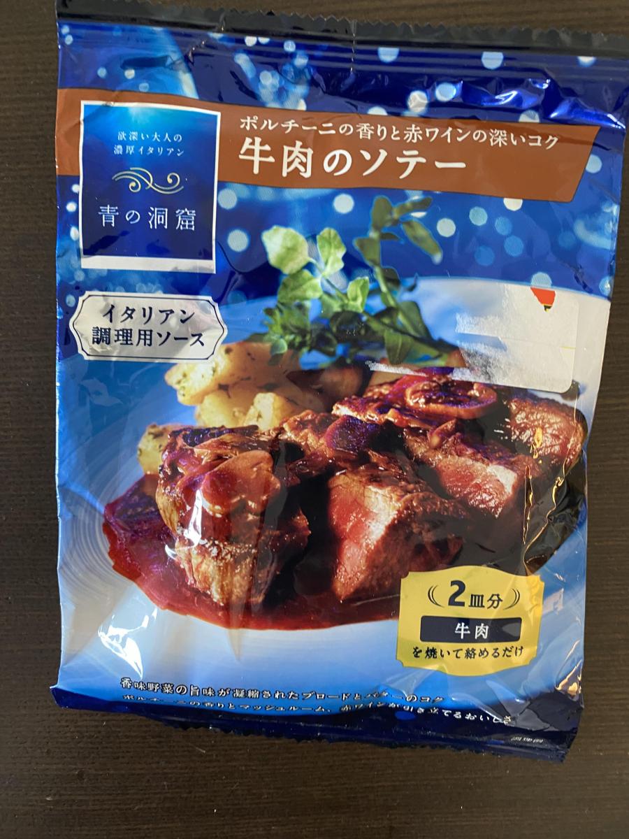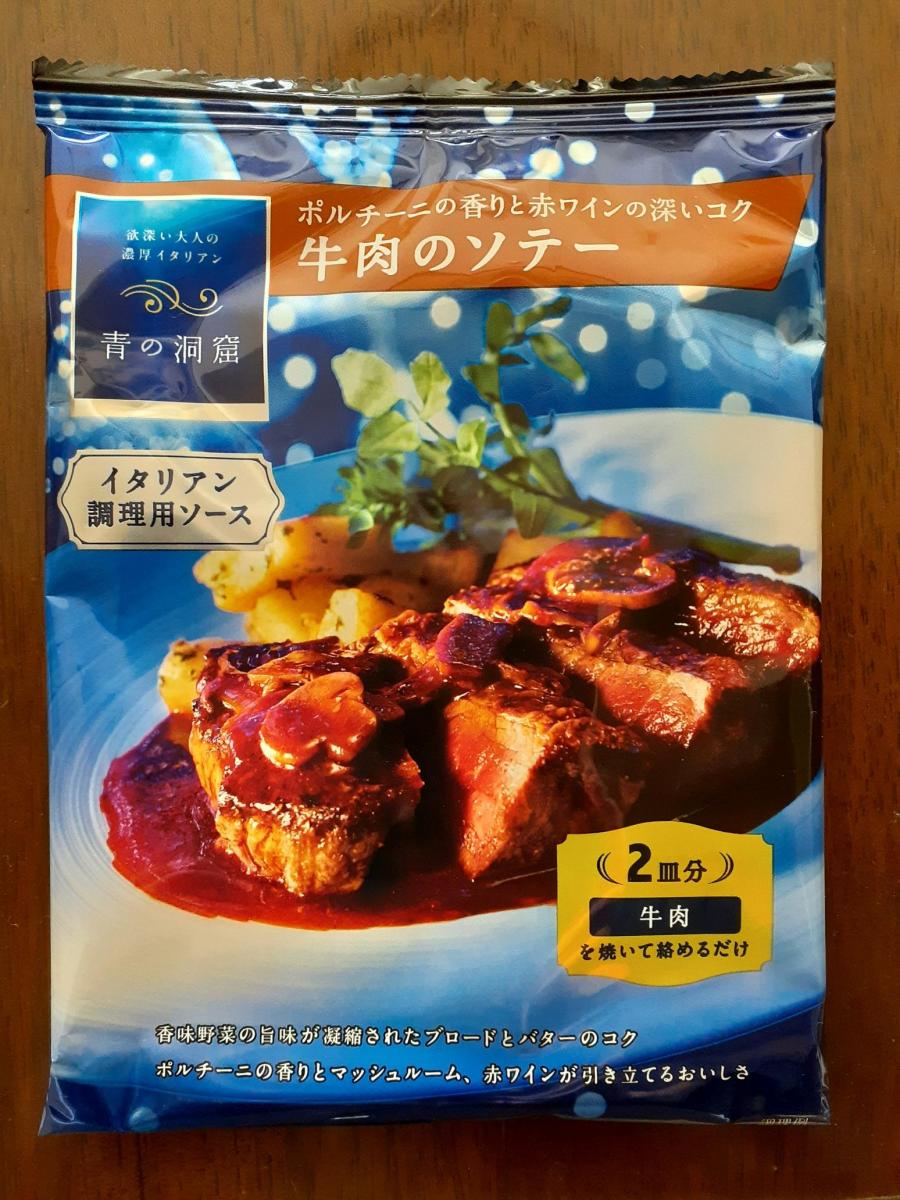 青の洞窟シリーズはパッケージから高級感があり、こちらは焼いた牛肉になじませるだけという手軽さでワンランク上のイタリアン料理が作れます。家庭では出せない味で、赤ワイン仕立てのソースはバターのコクとポルチーニやマッシュルームの香り・食感が肉によく合います。
