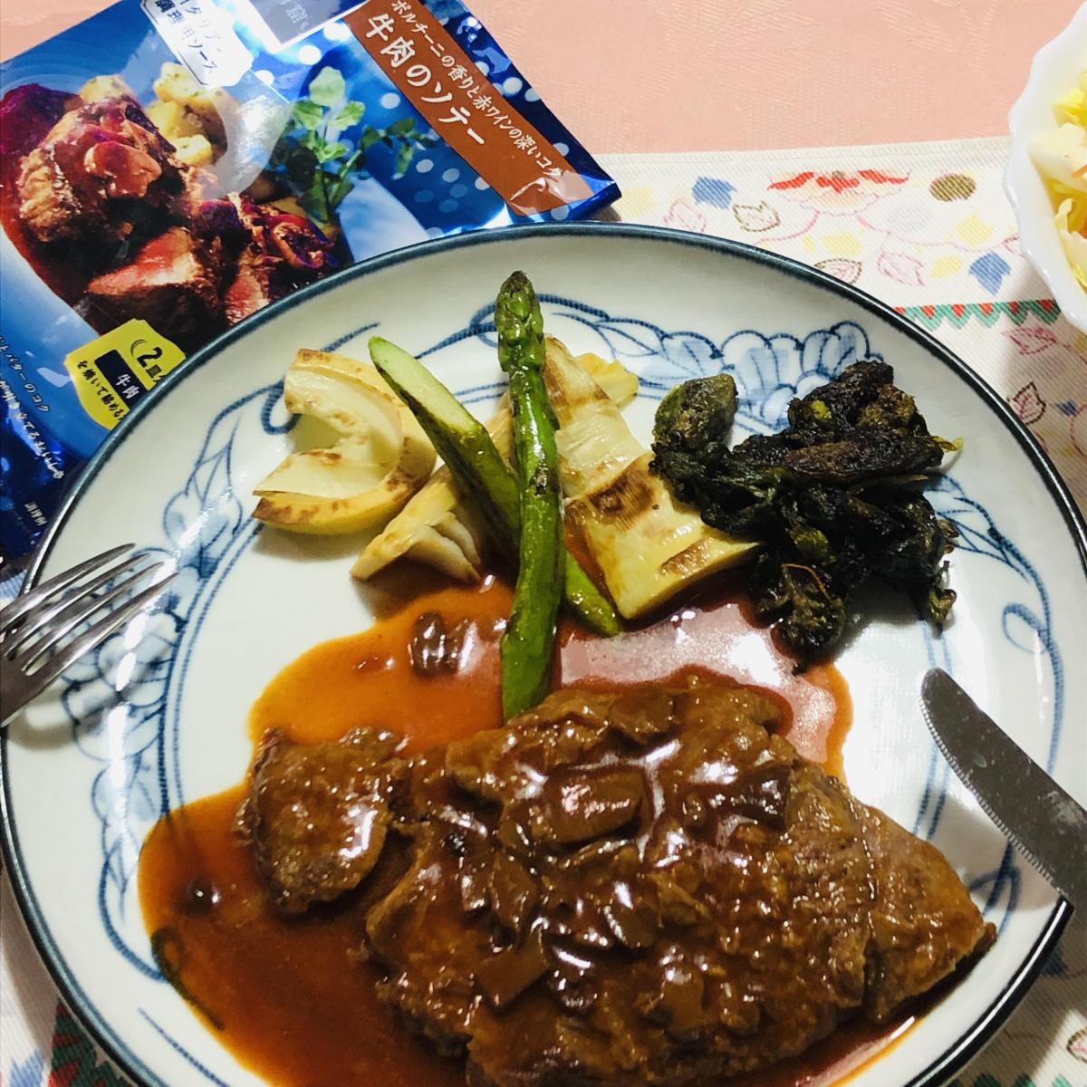 牛肉をソテーしたら、それだけでもそこそこ豪華で美味しいのですが、このソースを使うと格がひとつ上がります。ビストロのランチに出てきそうなポルチーニの香りとコクのあるソースです。ソースを残さないように、バゲットをお忘れなく。