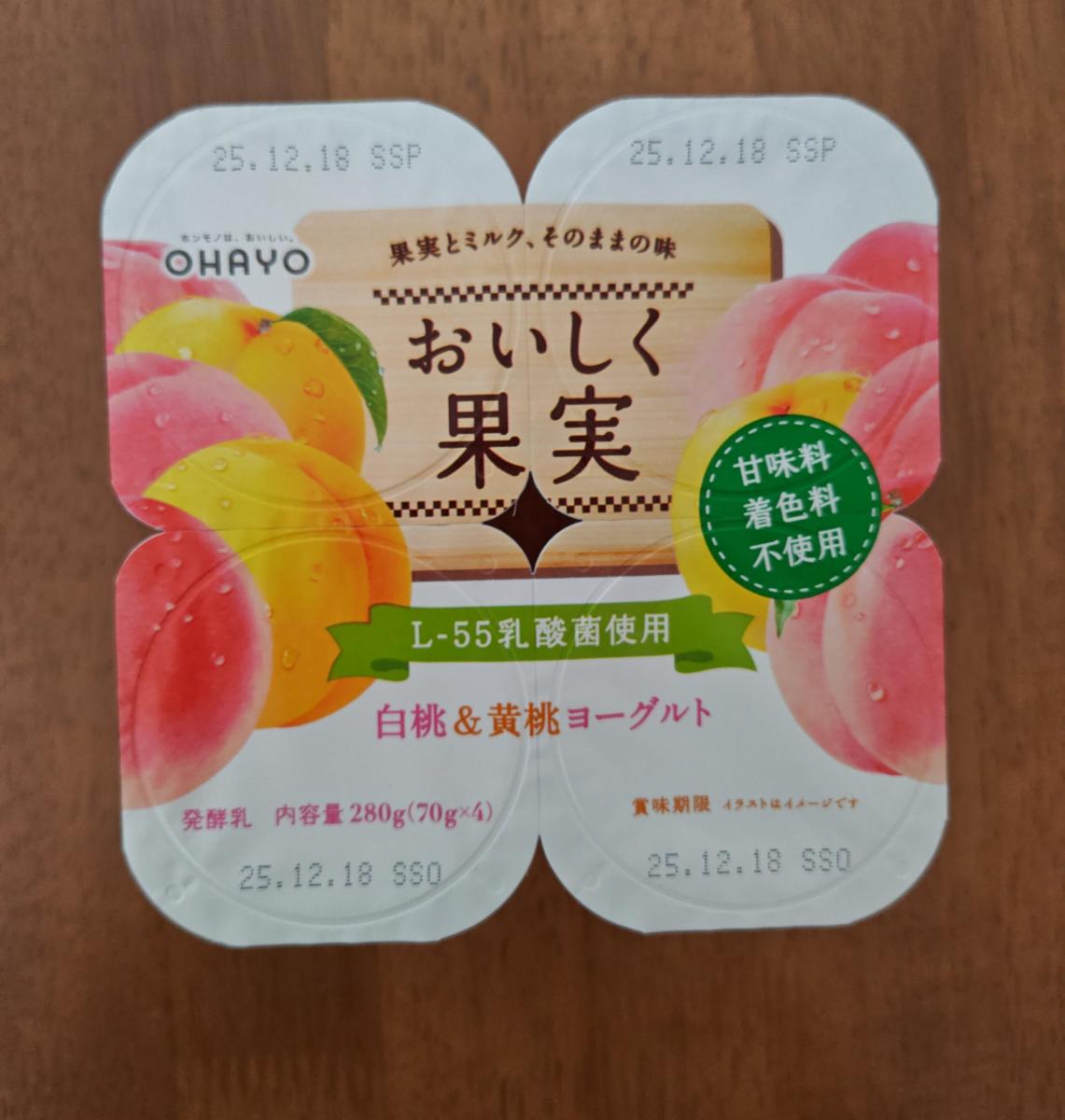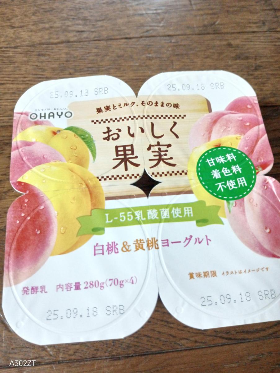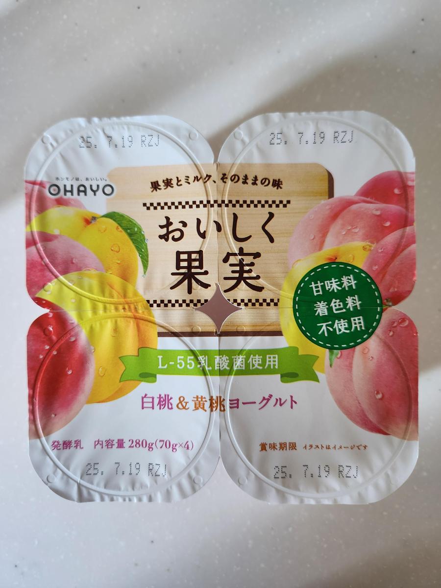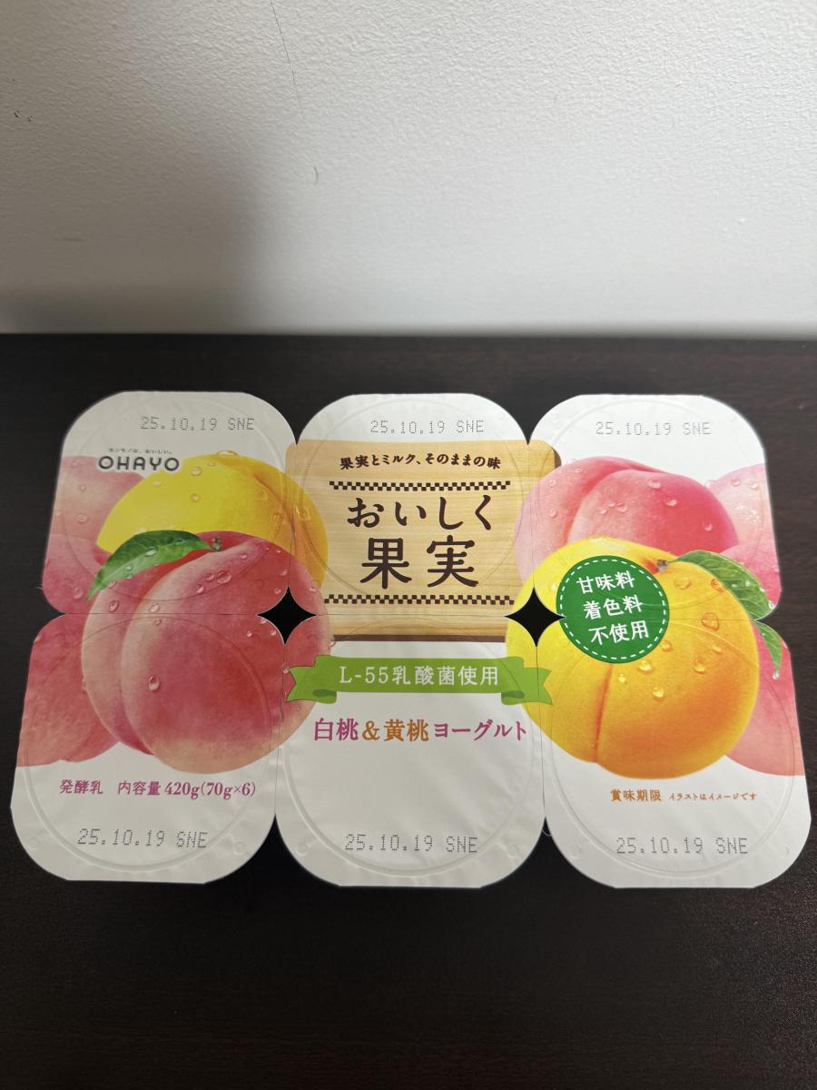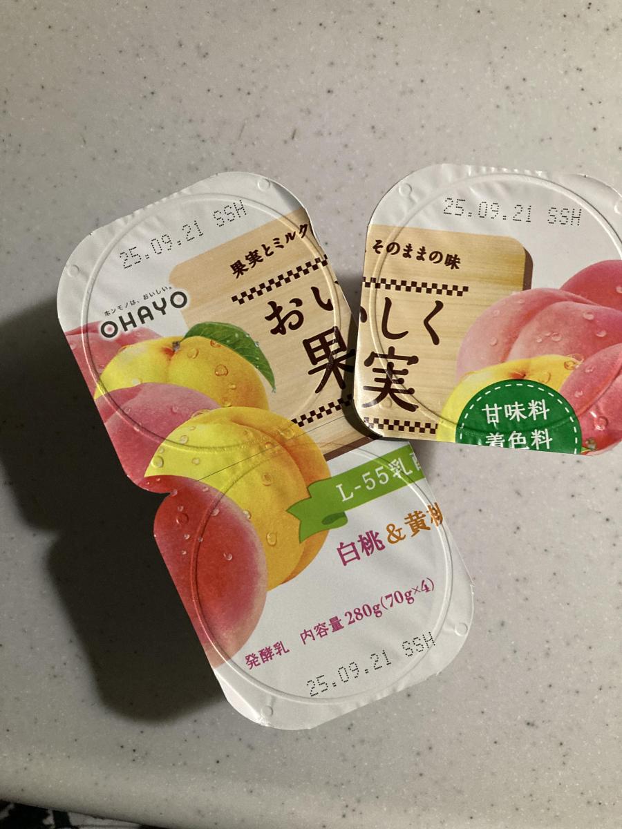 濃厚でなめらかなヨーグルトに甘い桃がいっぱい!白桃の甘みと黄桃のすっきりした甘み、どちらも味わえて満足です。オハヨーのおいしく果実はフルーツが食べやすいサイズ感でいっぱい入っているのでフルーツヨーグルト好きには嬉しいです。子供も食べやすいので毎日朝食に添えてます。