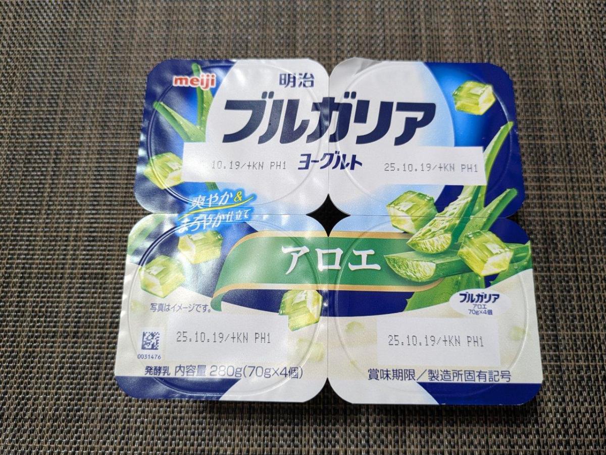アロエとブルガリアヨーグルトのマッチが実に美味しいです。4個分けでデザート代わりにたべたりおやつにもなります。甘すぎず量もちょうどよいです。横並びなのでちょっと冷蔵庫の場所を取るかな。