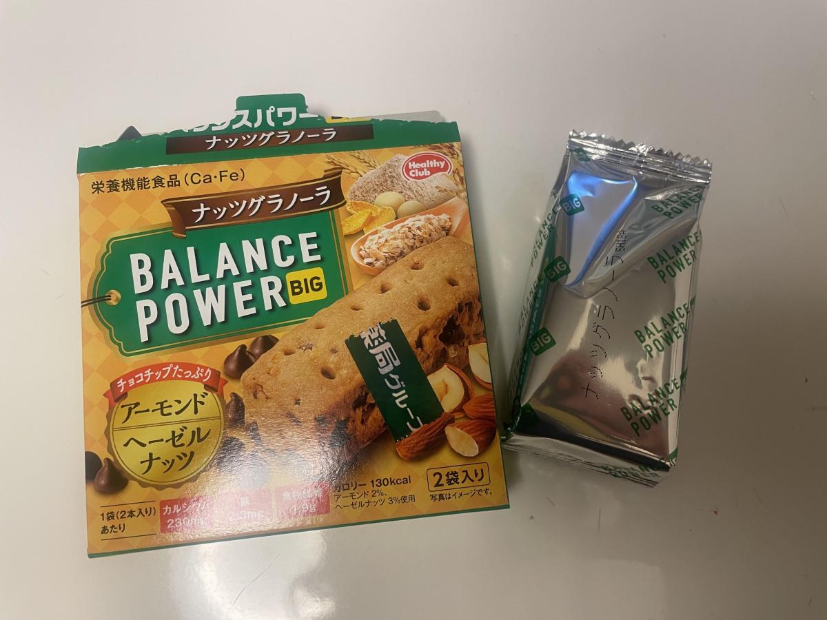 バランスビッグ、数種類ある中で、こちらはナッツとグラノーラ味です。ざっくりして噛み応えのあるナッツとグラノーラが生地にたっぷり入っており、2本入りです。130キロカロリーでちょっとした間食にも罪悪感なく食べらるのが良いと思います。