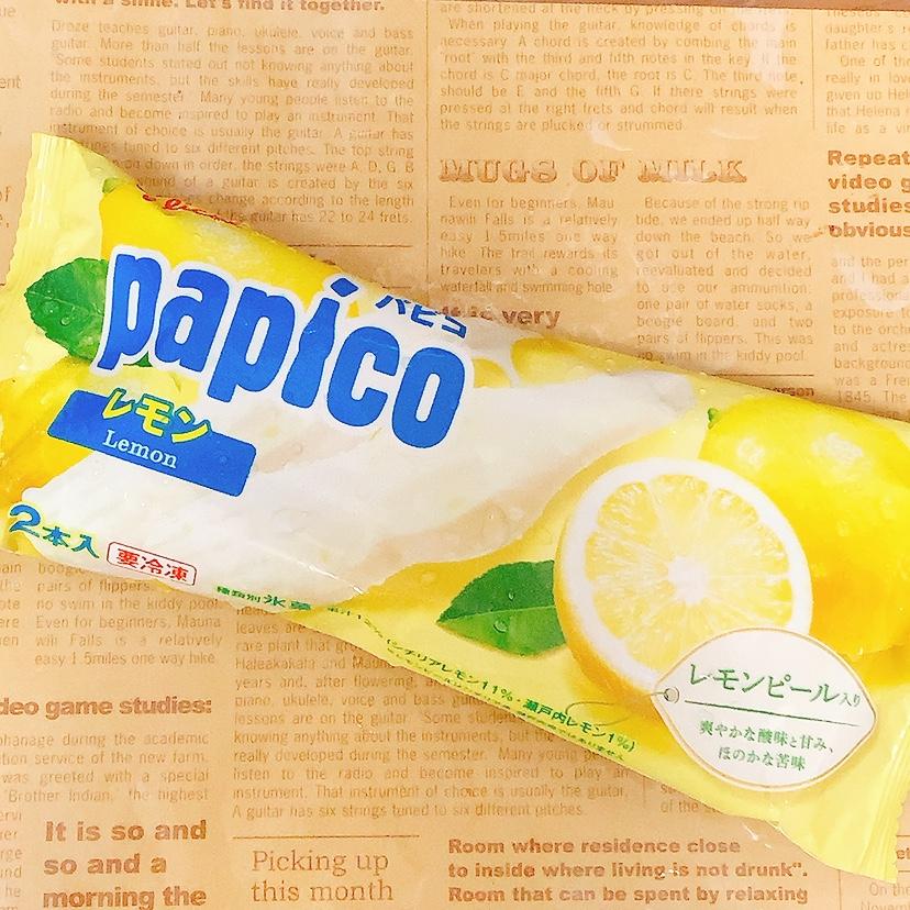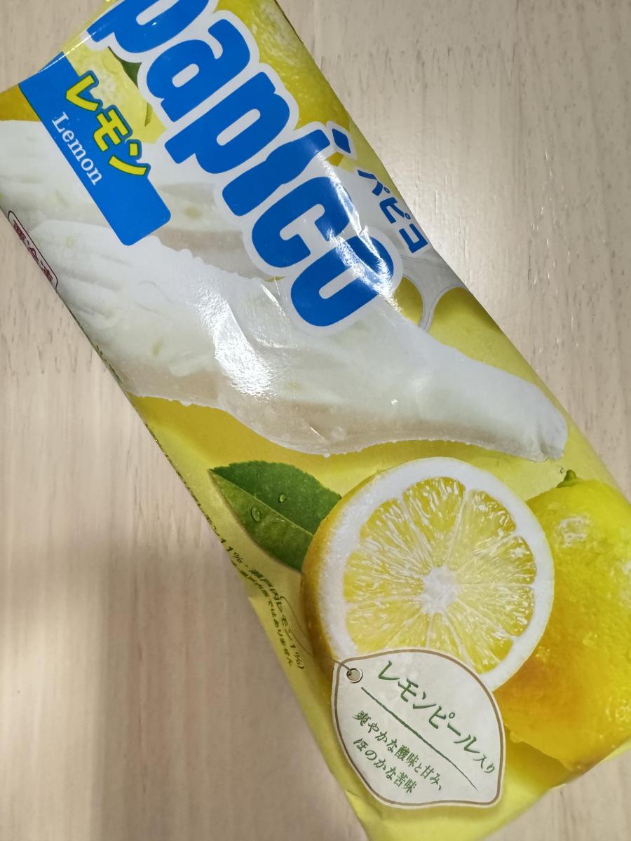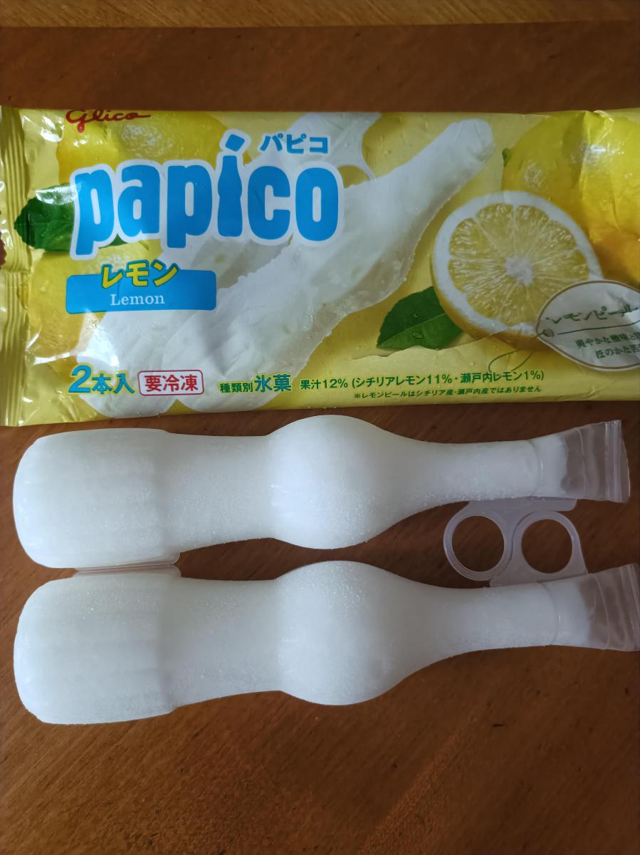 爽やかレモン味のパピコです。昔から変わらない仲良く半分こできる形ですが進化してジャリジャリだったのがシャリシャリなめらかで上品になりました。スイーツと呼べそうのものまで出るようになってしかも違和感がなく美味くいただけます。レモン味は酸っぱくなくてなめらかなシャーベットのようで夏に美味しいです。レモンピールのアクセントでちょっと大人味。