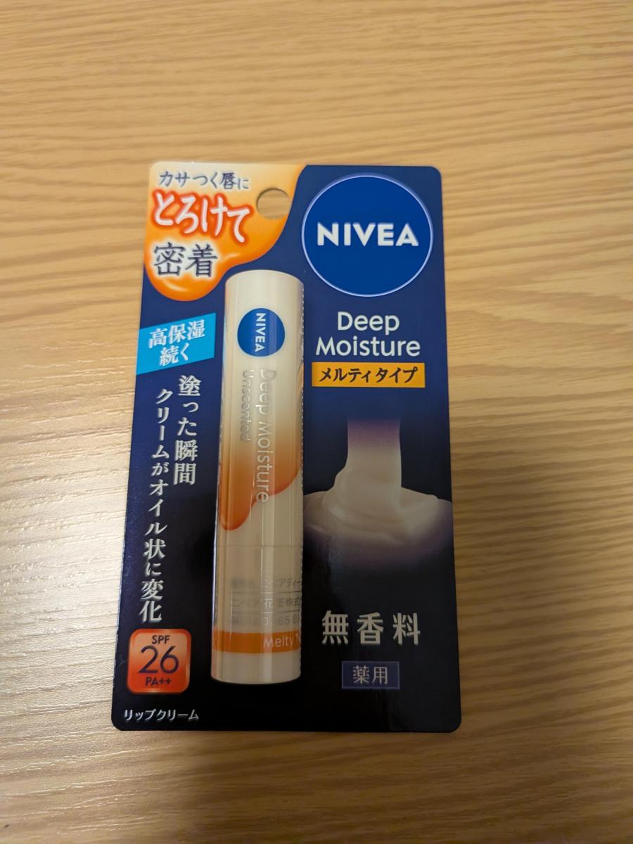 メルティという言葉がもうかなりのしっとり感を連想させる!大好きニベアのディープモイスチャーリップ使用しました。やはりひとぬりでかなりの保湿力あります。ガサガサだった唇もすぐうるおってくれたのでありがたかったです。また、このシリーズ色々な独特な香りがするものもありますが、こちらは無香料で万人受けするものだと思います。この1本になんとシアバター、はちみつ、アミノ酸系保水成分、トレハロース、ローヤルゼリーエキスが配合されていて申し分ないです。