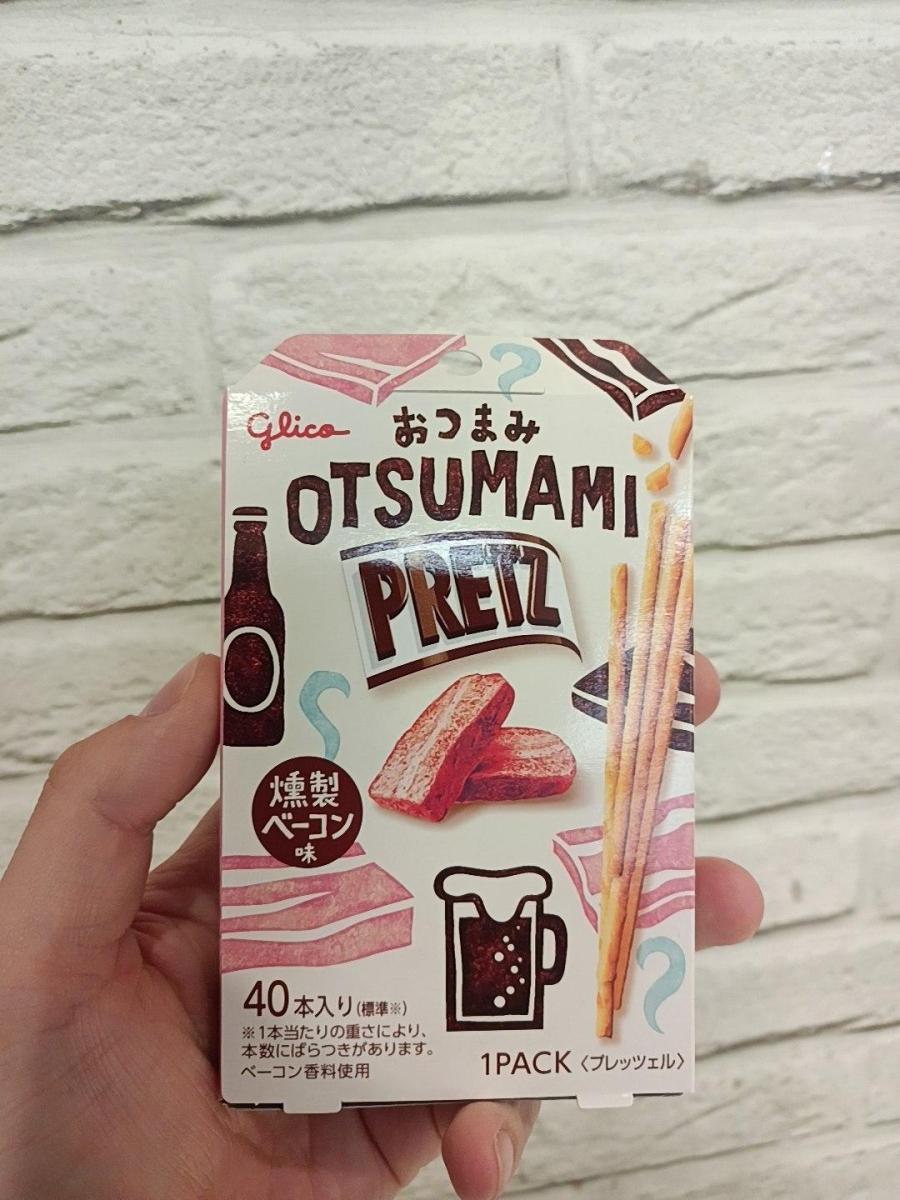 ものすごい細いプリッツでサクサク感がすごいです。味も濃くまさにおつまみ!燻製されたベーコンの味がしっかりと楽しめてビールが止まらなくなります。小さい箱ですが、一個で満足できます!