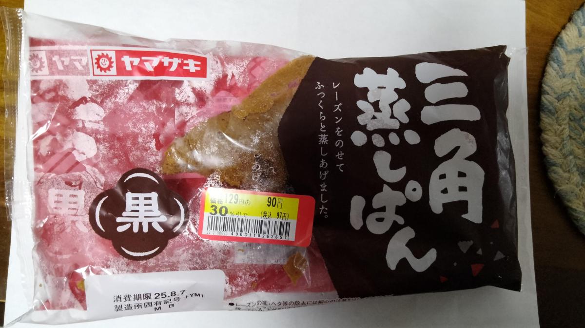 ふわふわの三角蒸しパン、レーズンいりです。ボリューミーでコスパ面でも良いのかなと思います。少しパサっとしてるかなと思いましたが、しっとりしていました。