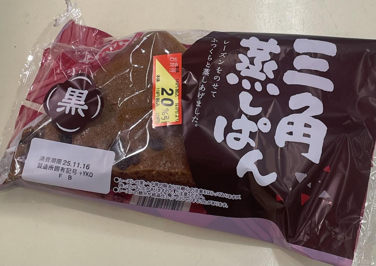 蒸しパンの商品は数あれど、三角形なのは特徴的で面白いですね。レーズンがアクセントになっていて、単調になりがちな蒸しパンでも飽きずに食べきれます。