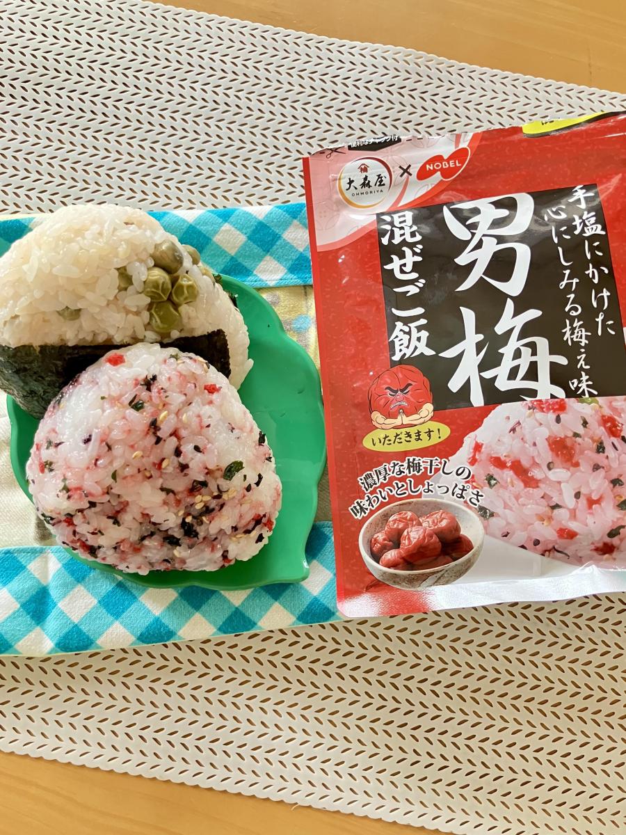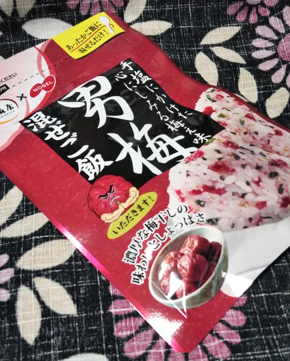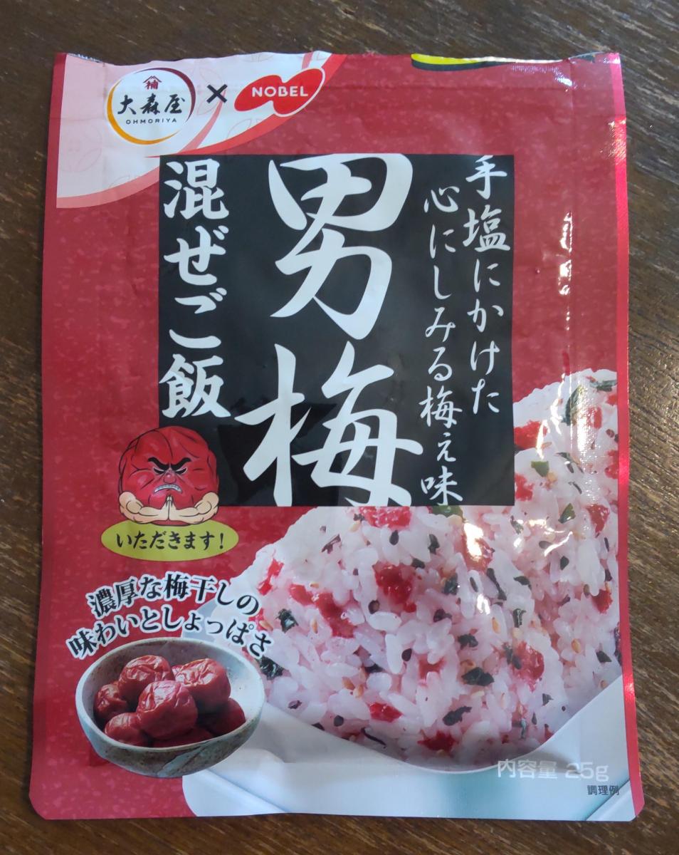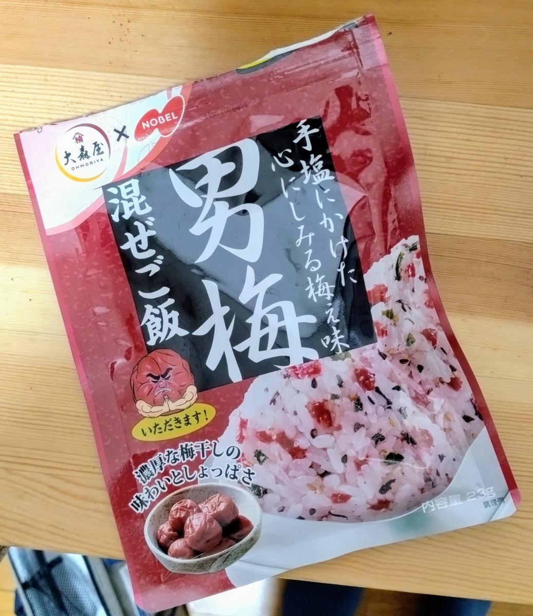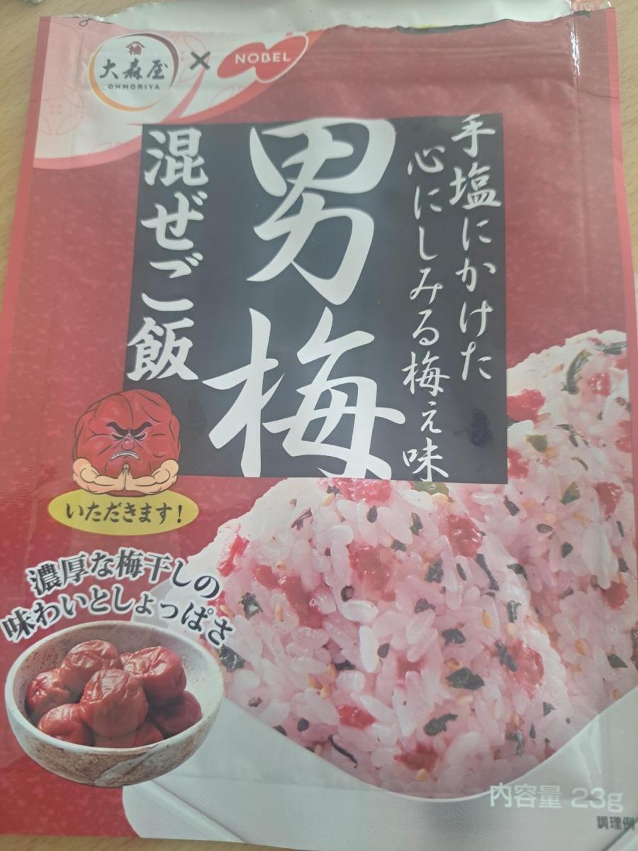 男梅の混ぜご飯、なんともくせになるしょっぱさです。ご飯に混ぜたら綺麗名色合いになり冷めても美味しいです。胡麻とわかめも混ざっていました。冷奴とかにも合いそうです。