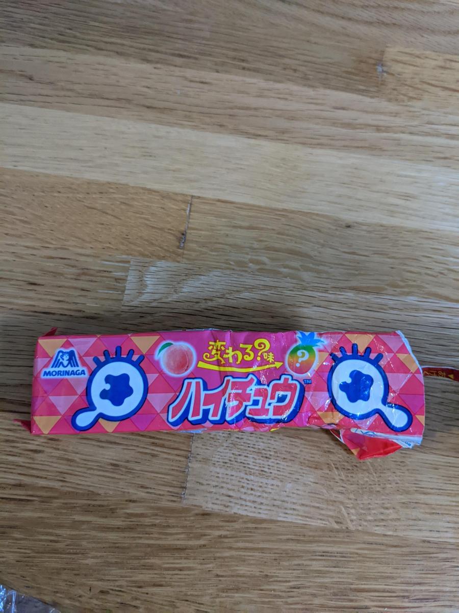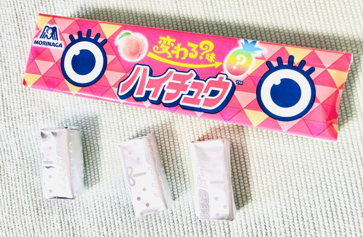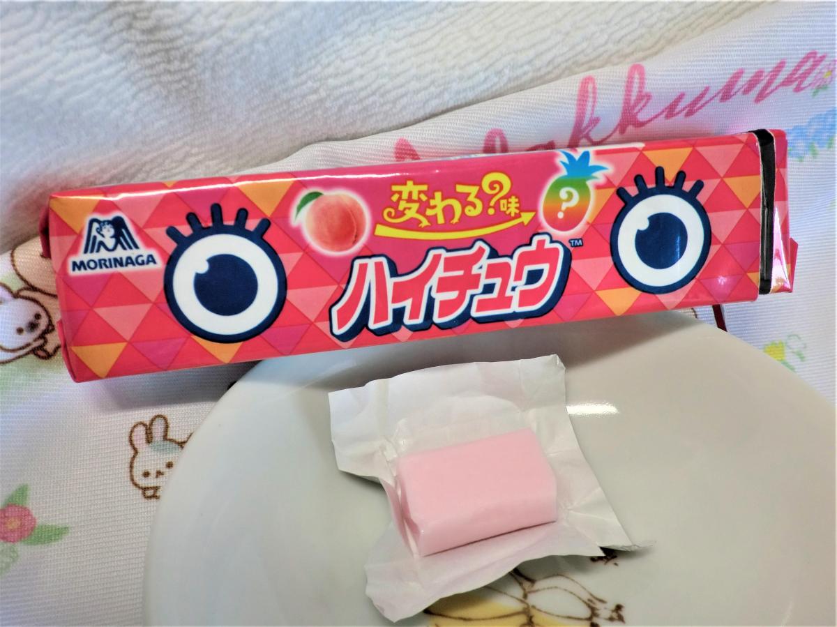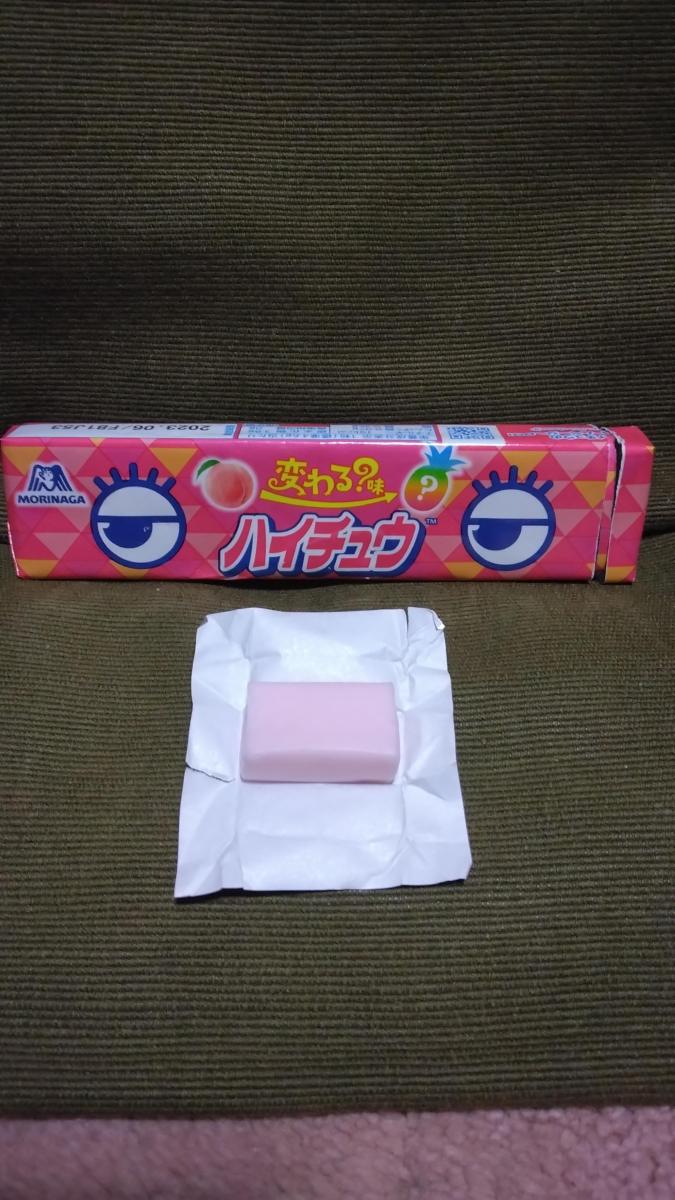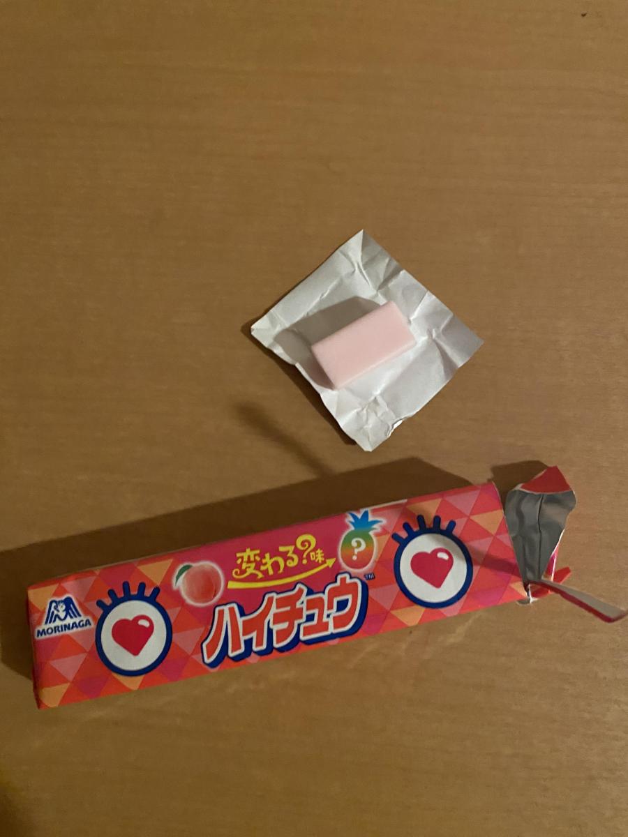味変が楽しめるというハイチュウ。物珍しさに惹かれ購入しました。最初はピーチ味のフレーバーなのですが徐々に食べ進めいくうちにパインのフレーバーに変わっていきます。美味しく一個で2つの味が楽しめるハイチュウでした。