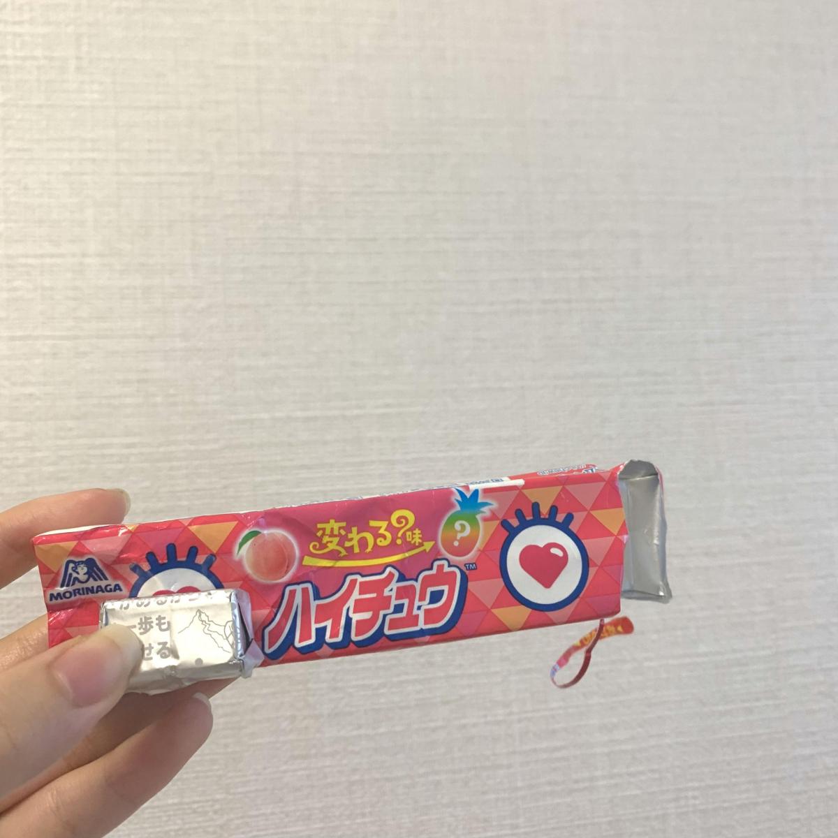 パクリと食べると桃の甘い香りがフワッと鼻を抜けていきます。口の中でハイチュウが溶けていくと桃のジューシーな味わいがじゅわ〜と広がっていきます。そのあと段々と味が変わっていきパイナップルの味に変化しました。美味しい〜♡2種類のフルーツ味を見事に再現していてお見事!と拍手したい気持ちになりました。