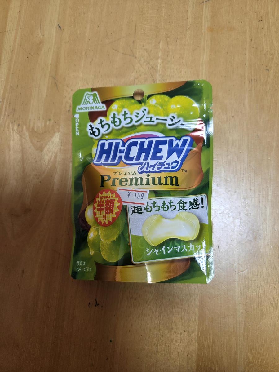 久しぶりにハイチュウを買いました。プレミアムがあるのをはじめて知りました。一口食べて見るとガムを噛んだような感触です。シャインマスカットのいい香りが口の中に広がって美味しいです。