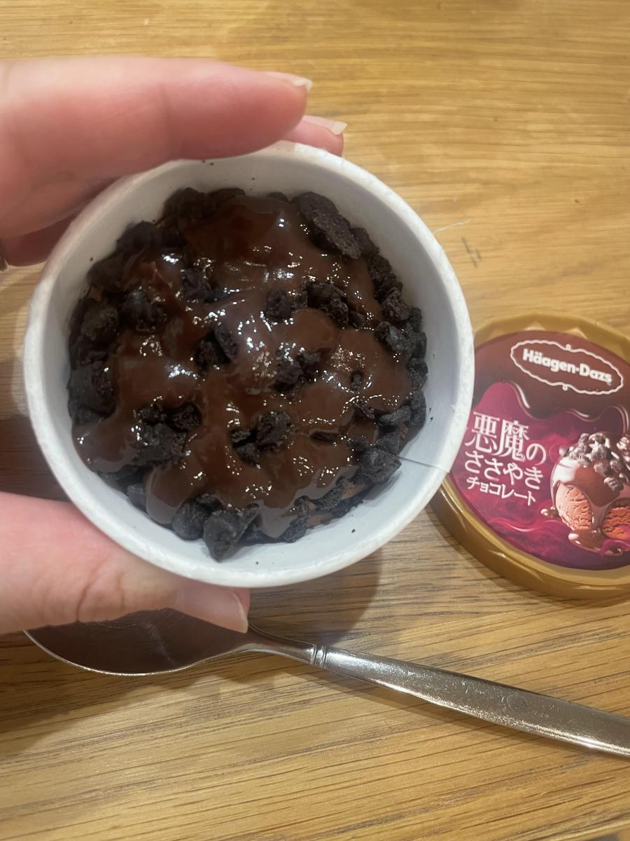 悪魔のささやきチョコレート初めて食べてみました。まず蓋をあけたらチョコレートトッピングがゴロゴロ、とろりとした濃厚チョコレートソース、下にはチョコレートアイスと豪華なアイスクリームです。一口食べたら濃厚なチョコレートが口の中で広がり甘いけど凄く美味しかったです。ハーゲンダッツシリーズは色々ありますが、満足度は高めな品でした。