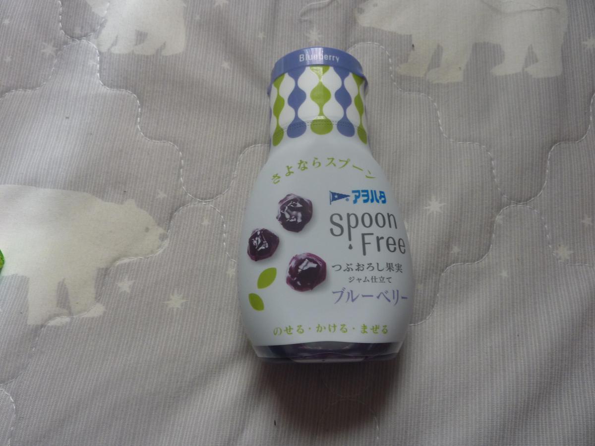 馴染み深い昔からあるブルーベリーのジャムです。いいですね。食事パンにもヨーグルトにもいつもむかしからつかってきたアヲハタのブルーベリーのジャム。さよならスプーンとありますね。確かに便利です。