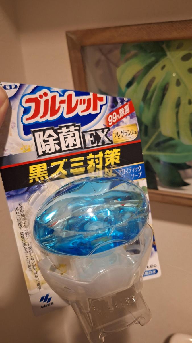 清潔感がある水色と、香りも見た目そのままの清潔なせっけんの香りがします。除菌EXシリーズのアロマタイプでこの香りが定番だと思います。本当に置くだけで黒ずみが消え去り、除菌が目に見えて嬉しくなります。