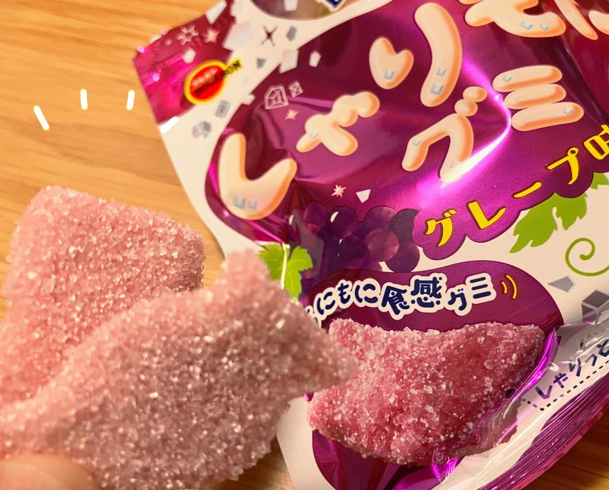 グミ表面にある甘酸っぱいパウダーが、噛む度にシャリシャリ気持ち良くてクセになる。パウダー効果か、サワーのようなシュワシュワ感もあって心地よい。味も、グレープの甘さと風味がしっかり感じられて食べ応えありました。