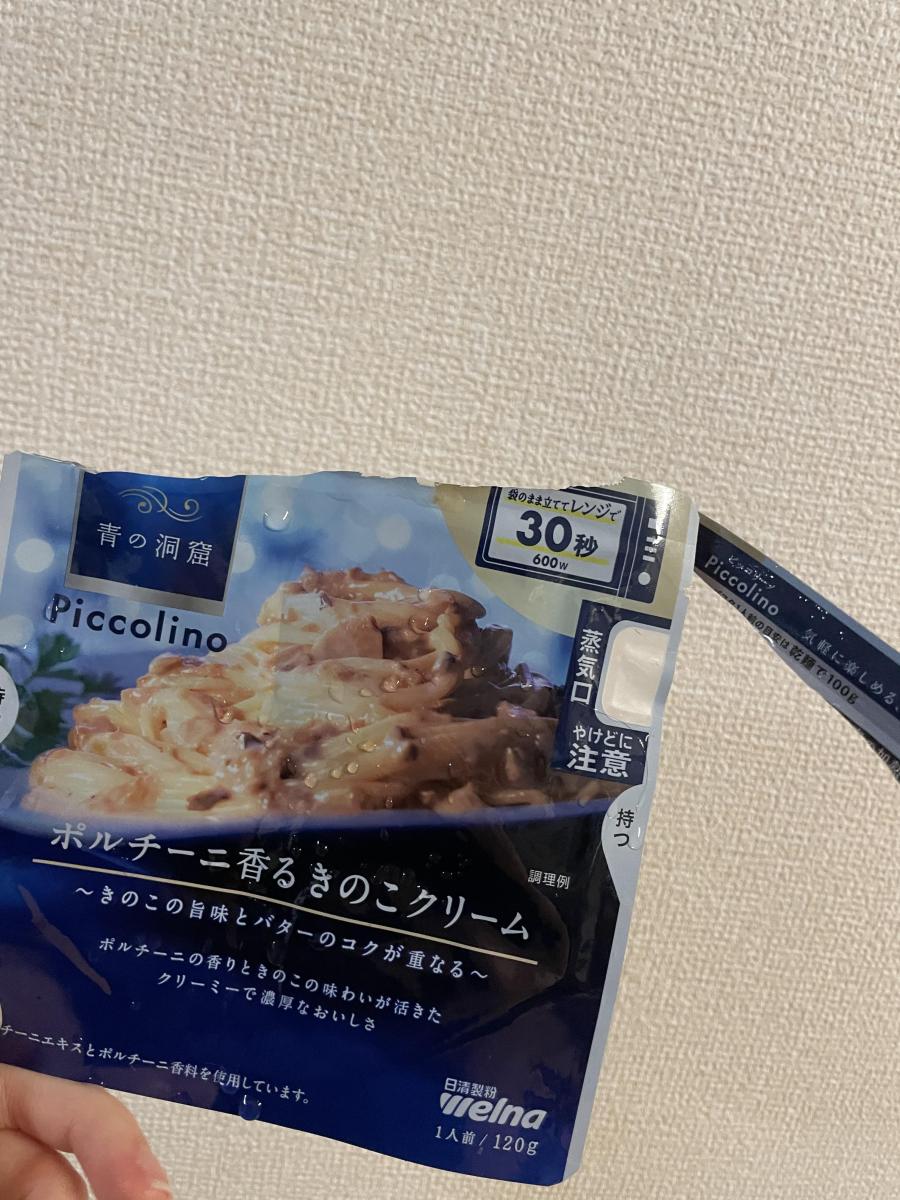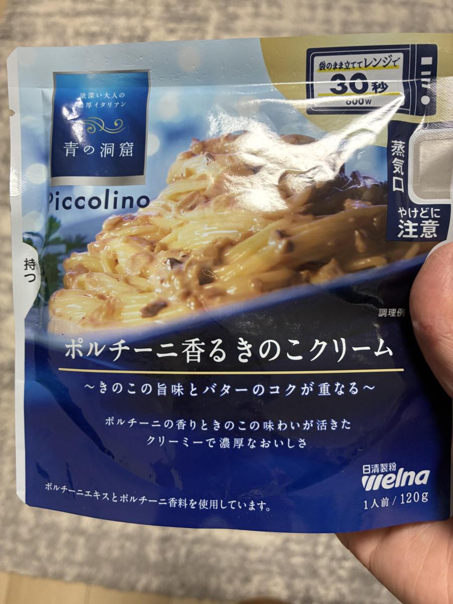 袋のままレンジで温めるだけで、手軽に食べられるタイプの青の洞窟シリーズのひとつです。しっかりとポルチーニの香りがして、きのこの食感も美味しいです。