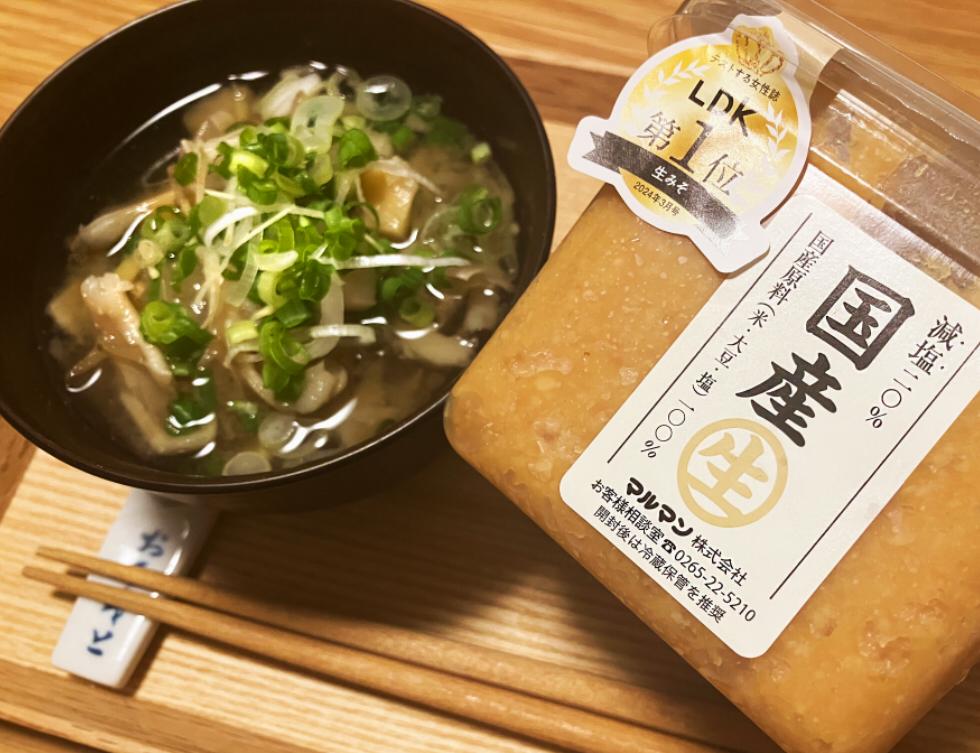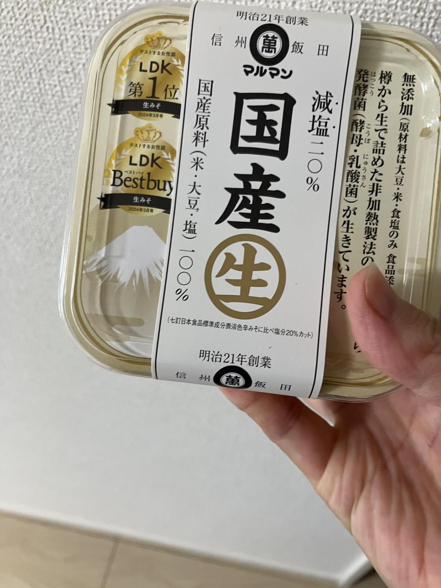 マルマンの「国産生 減塩20%」のお味噌。塩分は控えめ、だけどしっかりお味噌の風味とコクが感じられてとても美味しいです。出汁の旨味もちゃんと効いているため、物足りなさを感じることが無く普段量でしっかりと満足できました。口当たりもまろやかなので、そのままご飯に乗せて・きゅうりにつけて食べても美味しかったです◎