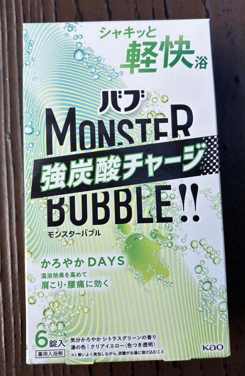 「モンスターバブル」「ジェット発砲」の文字に期待してたけどそこまで…?ふつうのバブよりタブレットが大きいのはあるけど泡泡感はそこまででもないように思った。癖のないシトラス匂いで控えめ。入浴剤として悪いところは無いけど、商品名に裏切られた気がして少し残念だった。