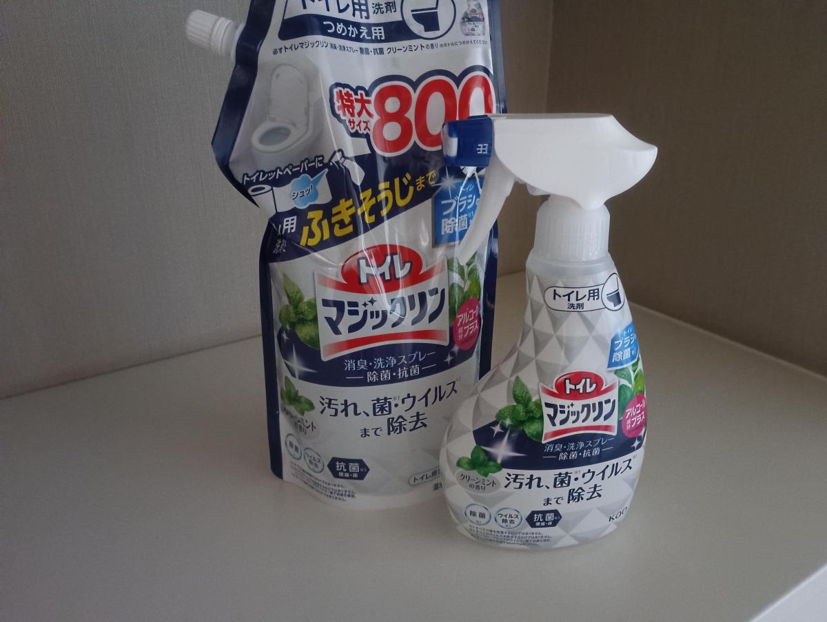 消臭・除菌・抗菌が出来るマジックリンスプレー。便器や床が汚れた時にさっとスプレーかけてブラシで擦ったりペーパーで拭くだけで簡単に掃除が出来るのでおすすめです。ミントの香りも爽やかで掃除が苦じゃなくなります。