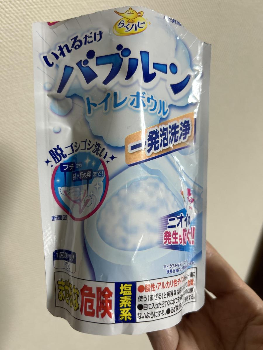 アースのらくハピ いれるだけバブルーン トイレボウル。トイレの洗剤を探していた時に見つけて購入しました。水洗トイレに粉を投入して流すだけという、取り扱いの簡単な商品です。ものすごい泡が発生するので少し焦りますが、しっかりと汚れや匂いを取ってくれます。