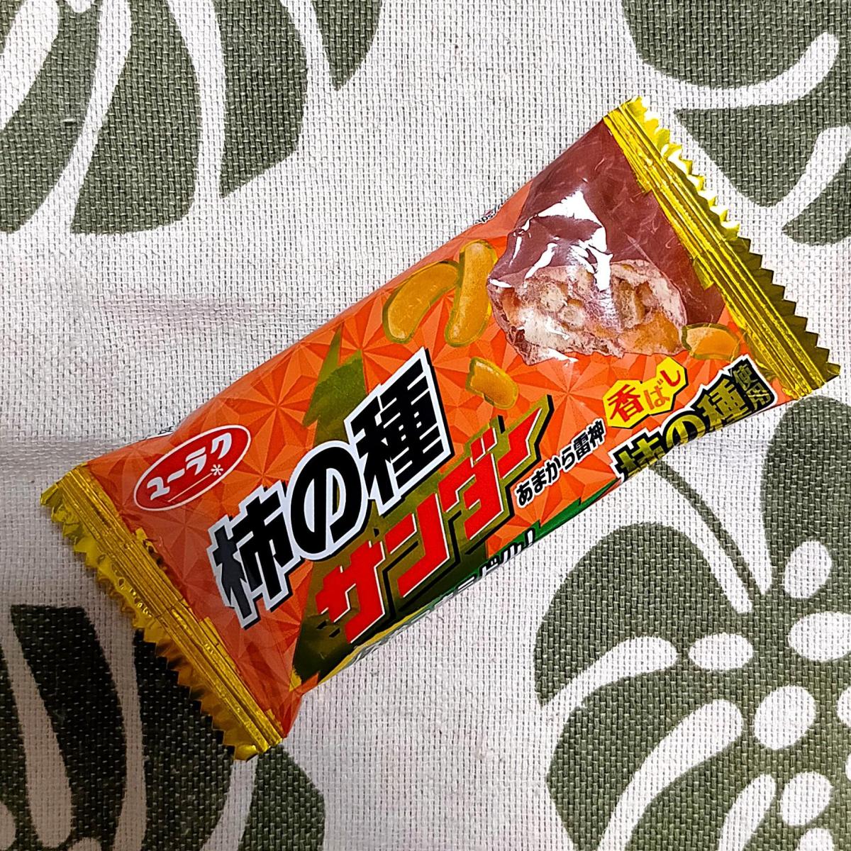 結構塩気がガッツリくる、甘じょっぱいサンダーです。柿の種の味と塩気を、チョコの甘さが包み込んでいる感じです。いつものザクッとした食感ではなく、サクッと軽い食感です。