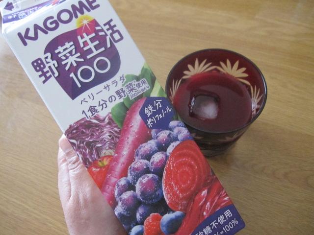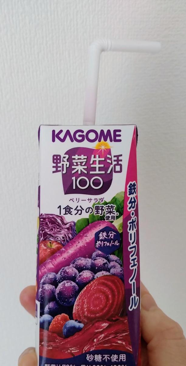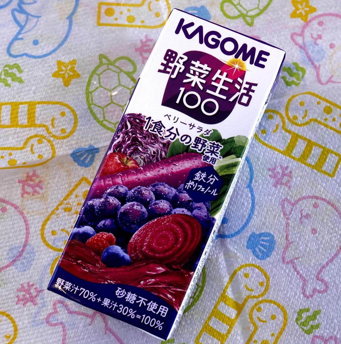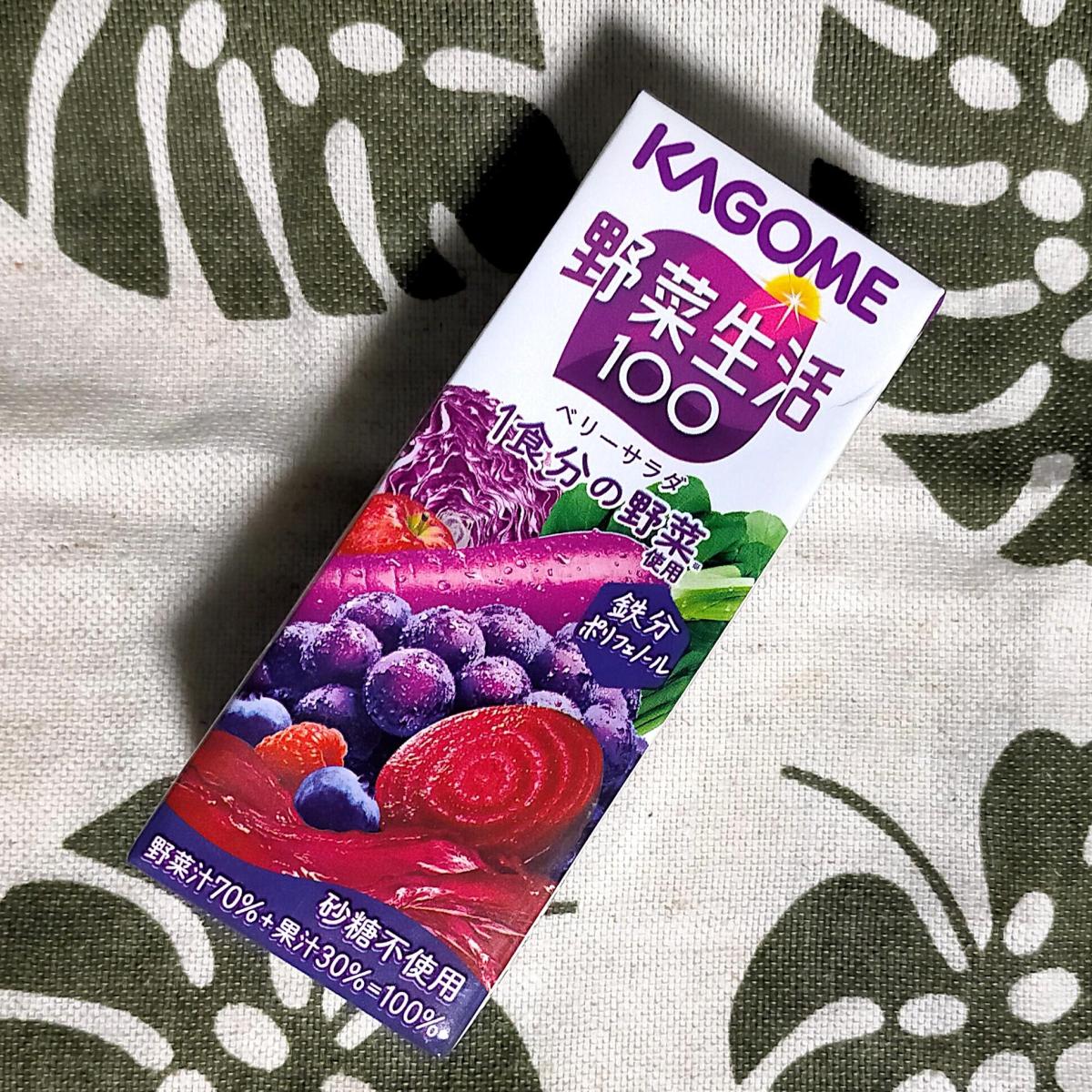 野菜生活100はよく好んで購入していますが、最近のお気に入りはこのベリーサラダ。ベリーと紫色の野菜をメインにしているからとっても濃い紫色のジュース。味も濃厚でこれで体にも良いんだから文句なしです。私はパソコン作業で頭が疲れたら飲んでいます。子供も「ワインみたい」と言って一緒に飲んでいます。