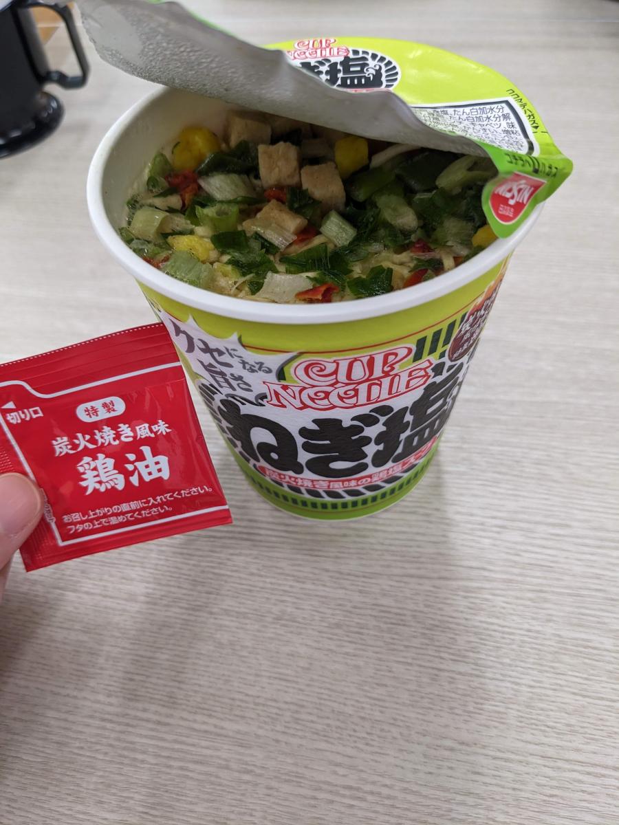カップヌードルねぎ塩は、たくさんのねぎが入ったラーメンかと思いましたが、ネギは普通の量でした。付属の炭火焼き風味鶏油を最後に入れると香ばしくて、風味よく美味しかったです。ベースは鶏塩ラーメンスープの味わいです。