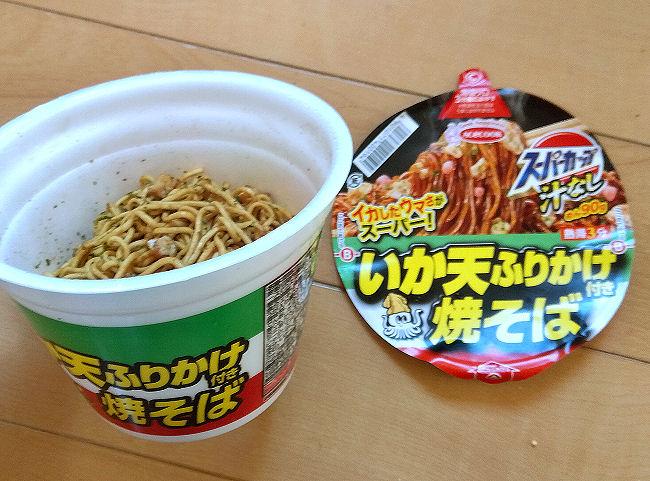 お湯を入れる時にはかやくは入れずふりかけとして湯切りをした後にふりかけるようになっていました。平たい容器と違ってかき混ぜやすくソースが麺全体に行き渡るのかなといった気がします。その代わりかやくが底の方に溜まってしまい姿がしばらく見えなくなる。イカ天の食感が良いので初めからどんどん食べたいですがほじくり出すしかなさそう。麺は太めの麺で歯ごたえがある。ソースも若干スパーシーで美味しいです。