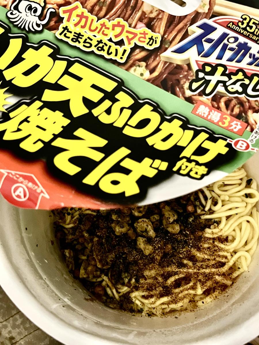 濃いソース焼きそばにイカ天ふりかけがプラスされてしっかり濃い味わい。白ごはんとも相性が良いです。ラーメンのカップ麺のような容器なので少し食べにくさはありました。