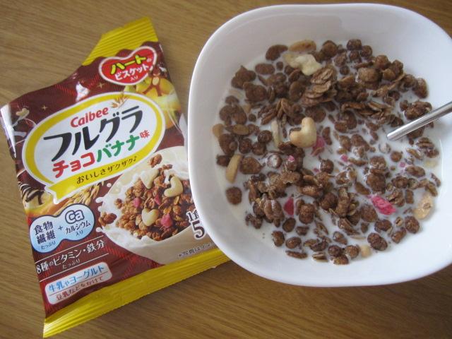チョコバナナ味は好きですが、このチョコバナナ味は苦手でした。可愛いハートのビスケットも味はいまいちで、可愛さだけはありました。好みが分かれる味だと感じました。フルグラシリーズ好きですが、こちらはリピートはないです。