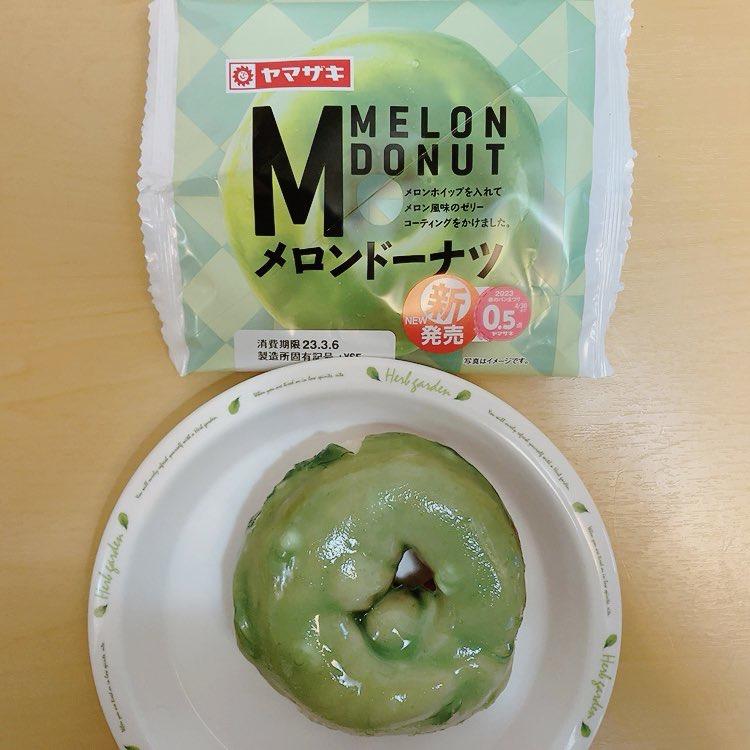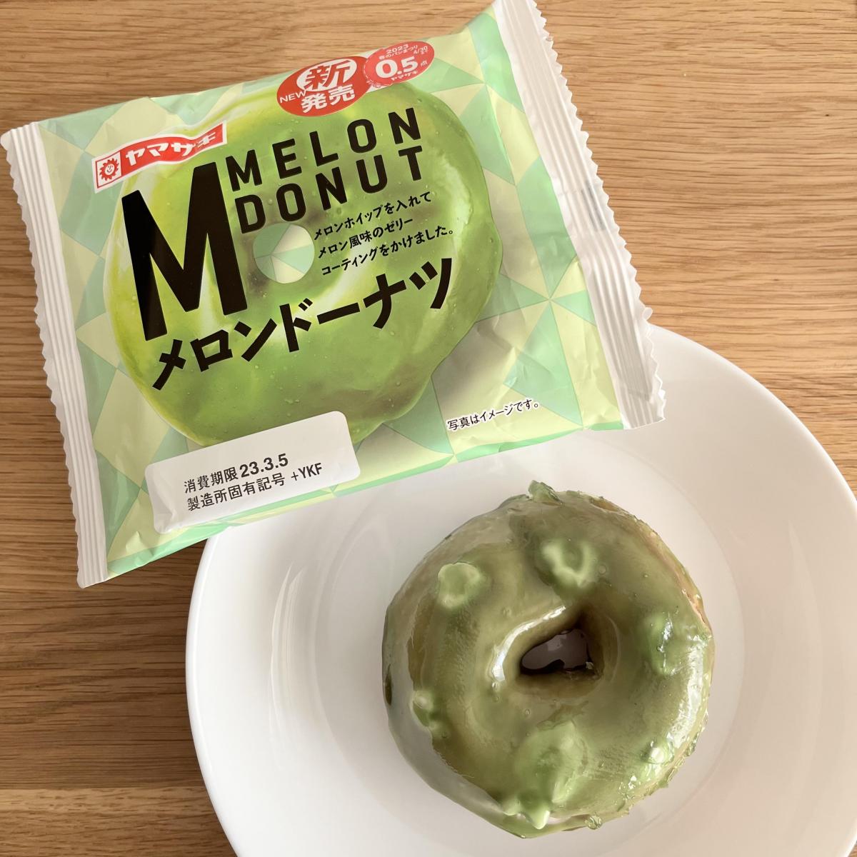 メロン味のドーナツです。表面にメロン味のシュガーコーティングがされており、中にクリームが入っています。