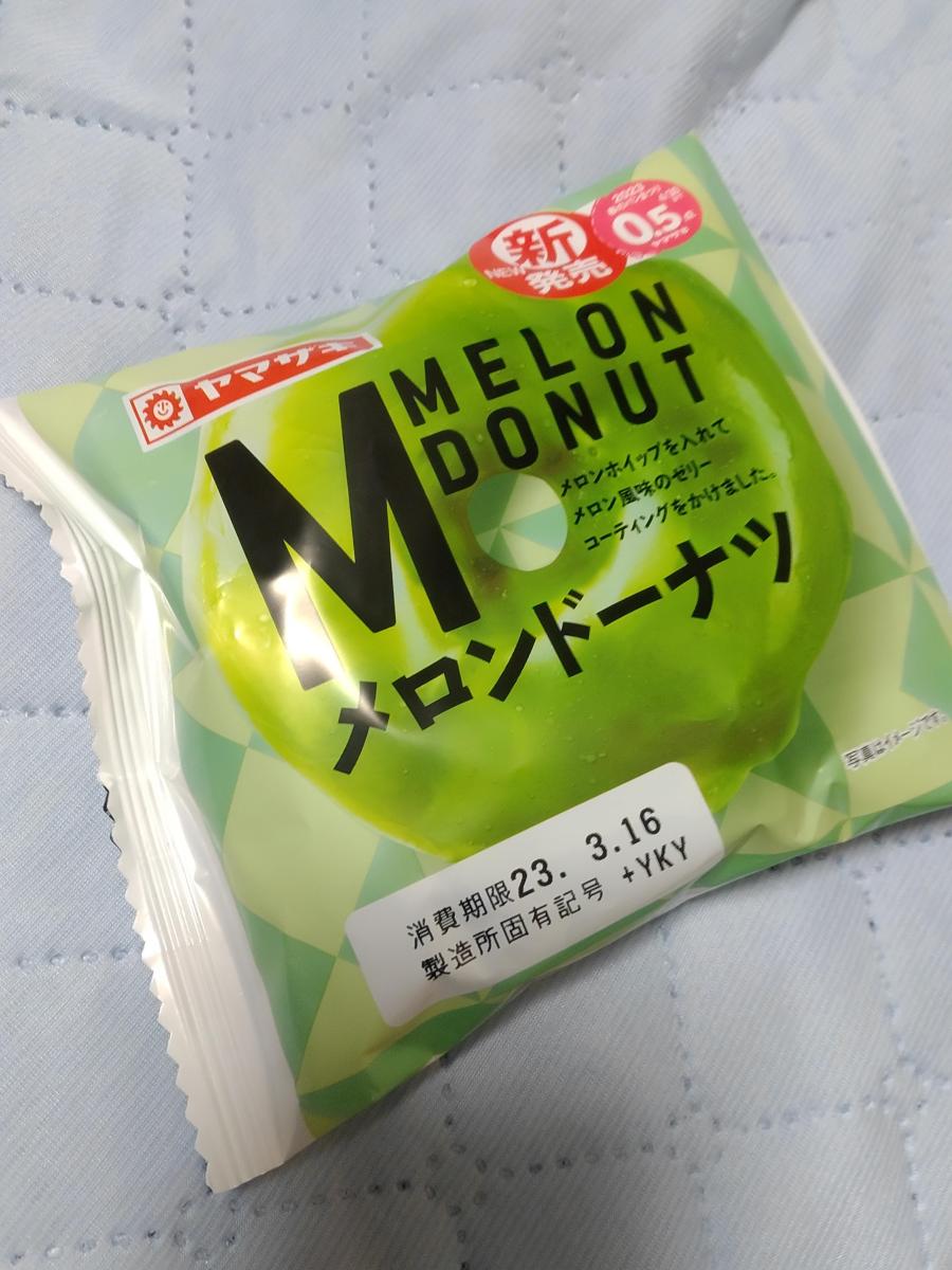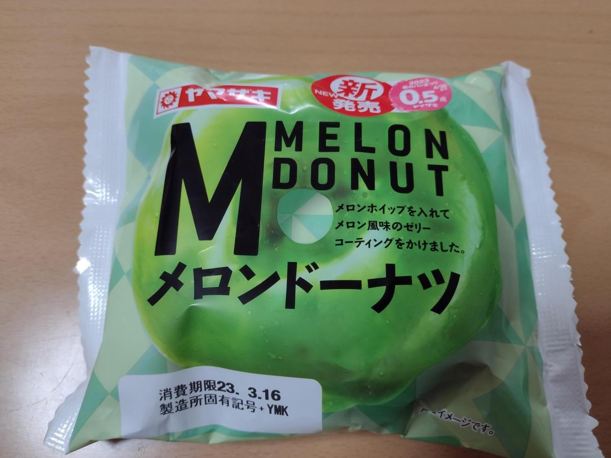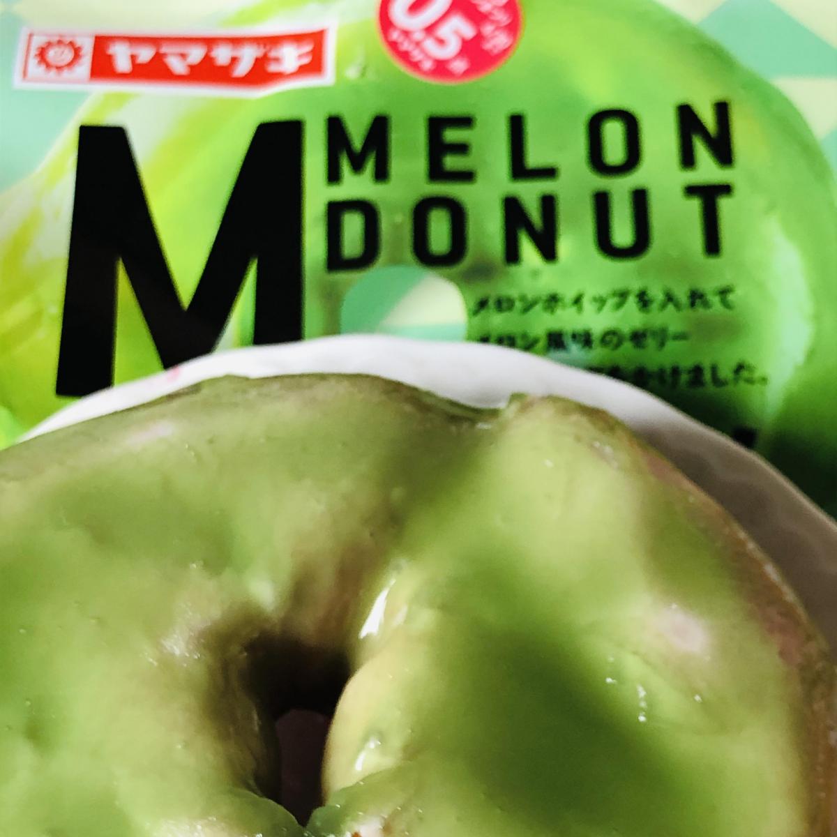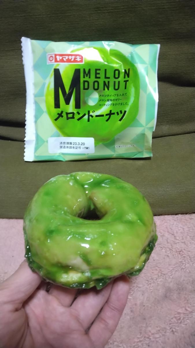 シンプルなネーミングにインパクトのあるパッケージに目が止まりました。発色のよいグリーンのゼリーコーティングされた、メロン味ドーナツ。ツヤツヤテカテカです。
