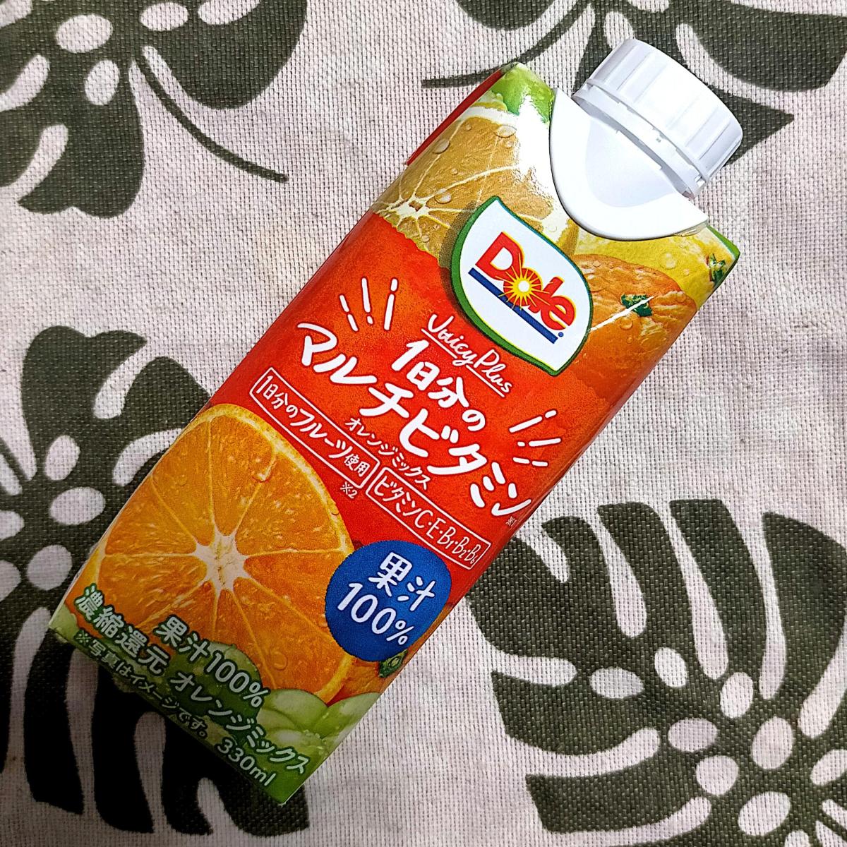 1本で1日分のマルチビタミンが入っています。オレンジやマスカットが入っているようですがオレンジの味がとても強いです。果汁100%なので味がとても濃いです。紙パックですが、蓋が開け閉めできるので一度に全部飲まなくてもいいので外出先でも飲めて良いです。