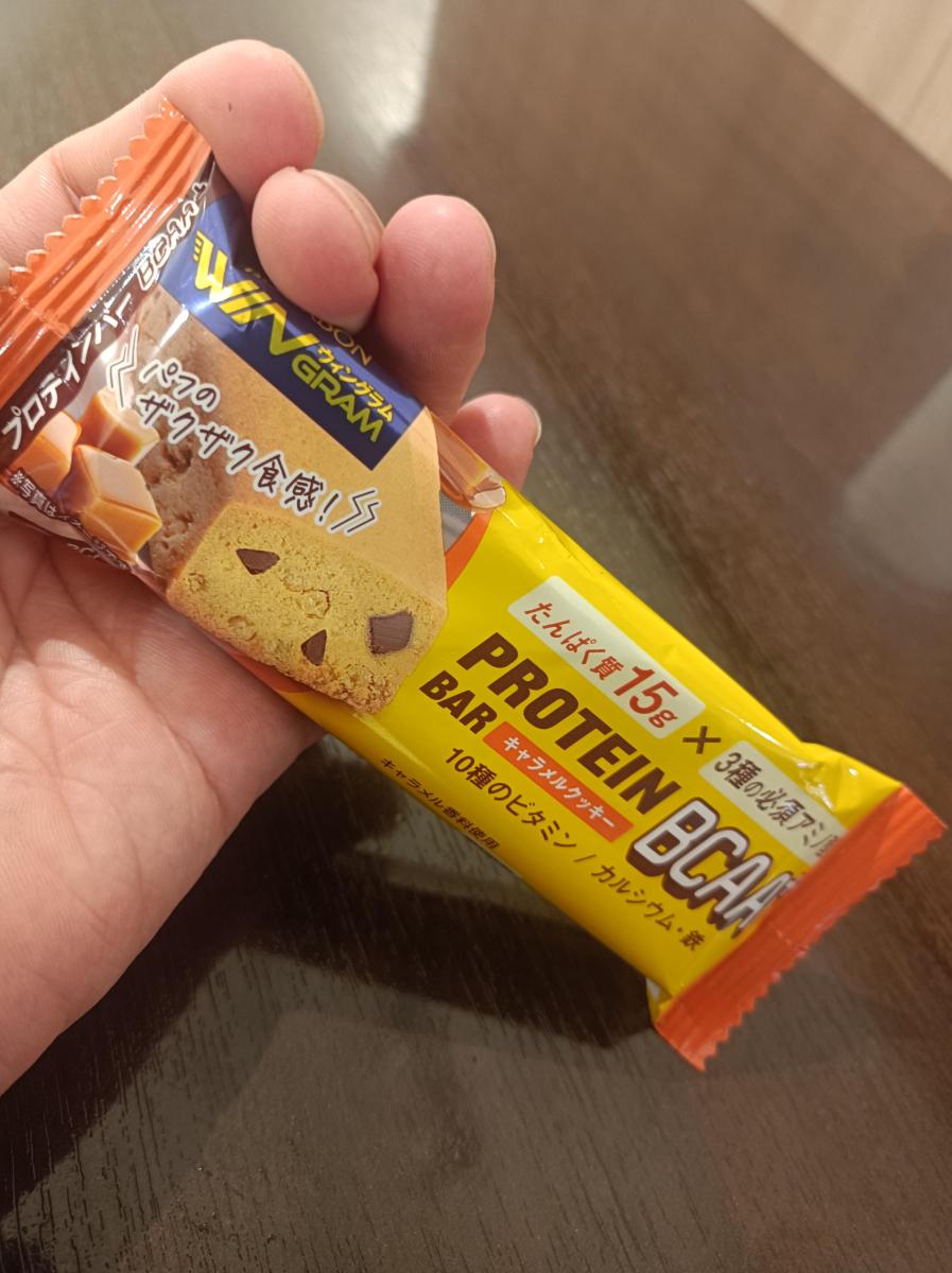 ブルボンのプロテインバー。キャラメルクッキー生地は、甘みがあり、ずっしりとしており、タンパク質が15gとれる。味はキャラメルの甘さとチョコチップのアクセントでおいしく、満足できる商品。