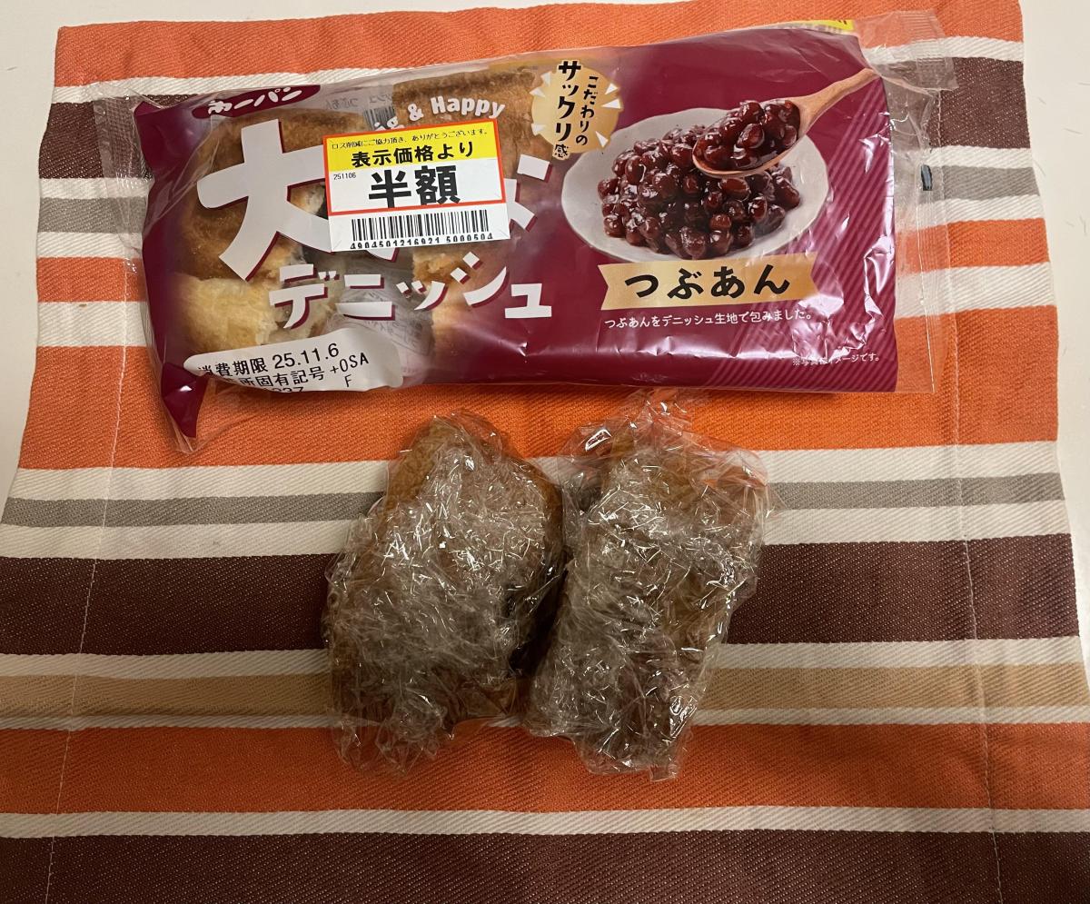 大きなデニッシュパンなのに100円ちょっとで購入できます!しかもその半額!だったのでかなりコスパよく購入できてラッキーでした。とても大きくてデニッシュ生地もしっかりしているのでとても食べ応えあります。中のつぶあんとの相性とも抜群です。私は半分はそのままで、もう半分は写真のようにラップして冷凍して食べる食べ方が好きです笑。デニッシュアイスみたいになって美味しいです。
