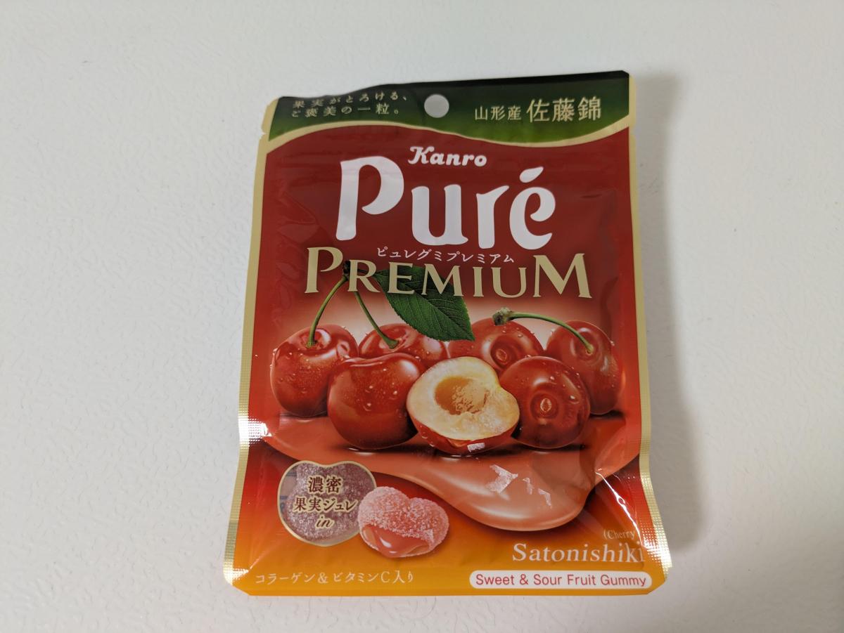 モチモチとした食感のグミの中にねっとりとしたジュレが入っています。佐藤錦の華やかな甘さがじゅわ〜っと口の中に広がりすごく贅沢感があります。想像以上に佐藤錦の味わいが濃厚で衝撃的でした。これは美味しい。納得、満足の一品です。プレミアムという名前に見合った高級な味がしました。普通のピュレグミよりも値段は高いけど価格以上の価値を感じました。また見つけたら買いたいです。