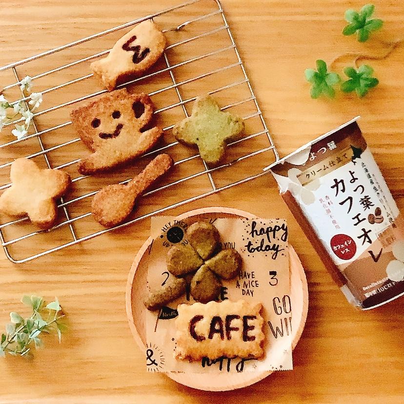 よつ葉カフェオレのパッケージを見ながらイメージが出てきたので、コーヒー味、ミルク味、抹茶味で型抜きクッキーを作って、よつ葉クッキーセットを作りました°˭̴̵̶͈ૣᴗ ˭̴̵̶͈٭ෆ˚*