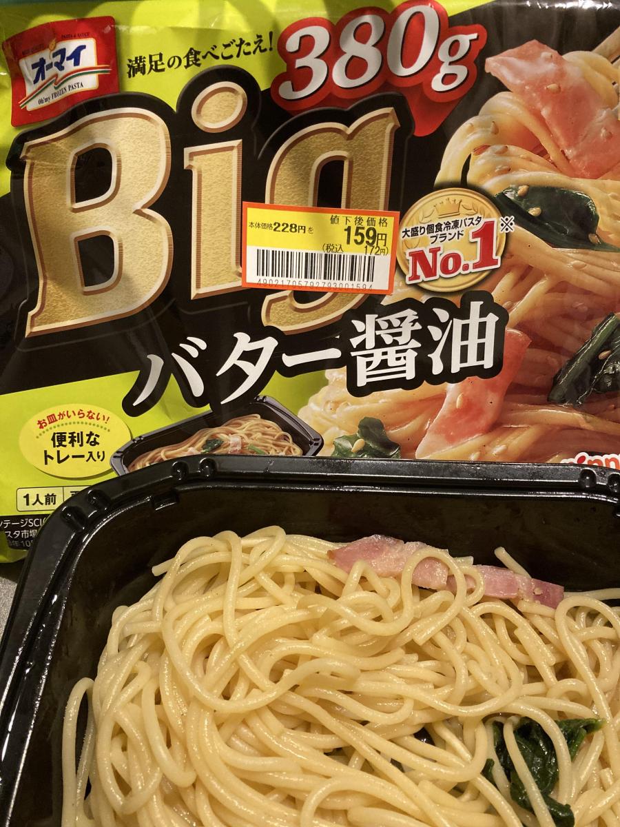 トレイごとレンジOKで便利。バター醤油味ですが、どちらも薄く感じました。特にバターの風味がもっとあればよかった。具はほうれん草とベーコンが少し。